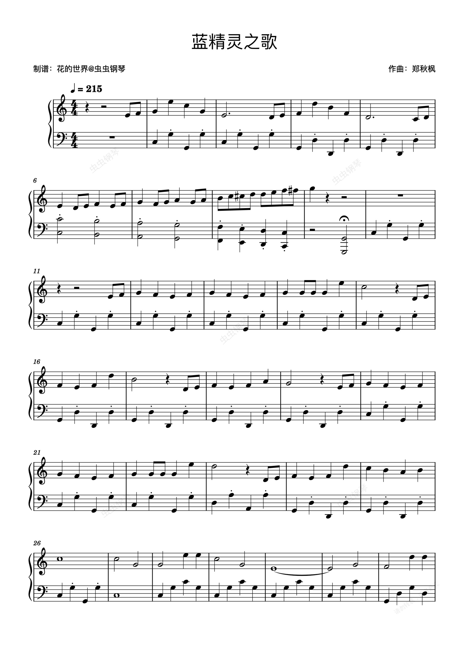 钢琴谱:可爱的蓝精灵 蓝精灵之歌 C调简易版 经典儿歌