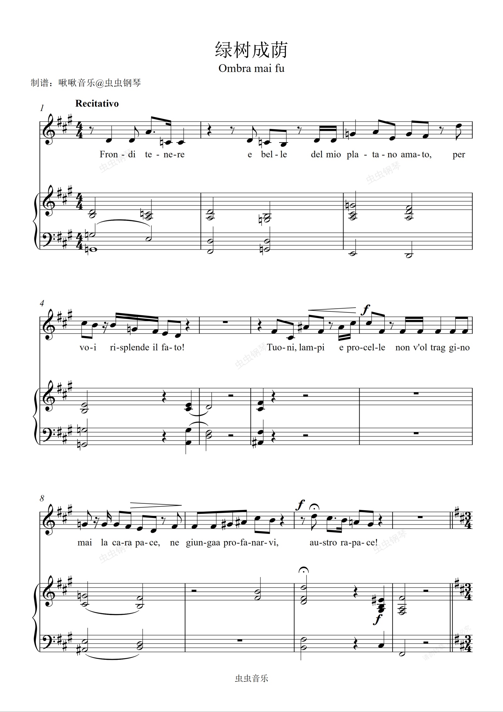 钢琴谱:绿树成荫 Ombra mai fu 钢琴弹唱伴奏谱