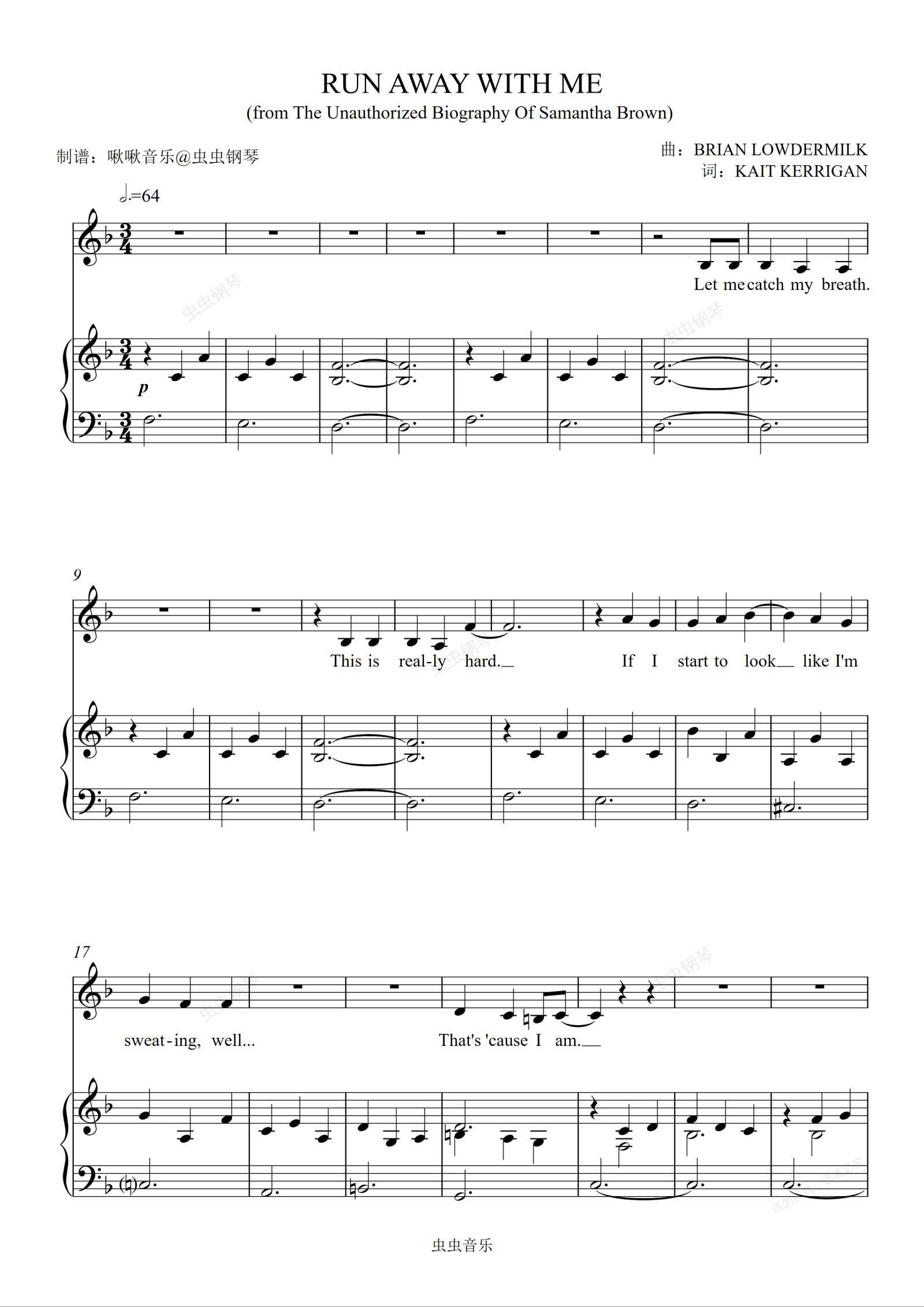 钢琴谱:RUN AWAY WITH ME (from The Unauthorized Biography Of Samantha Brown) 钢琴弹唱伴奏谱