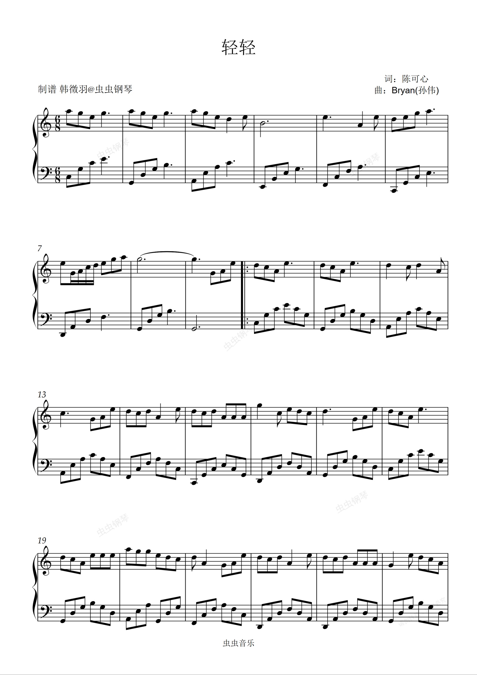 钢琴谱:轻轻 《长风渡》主题曲 C调简单易弹