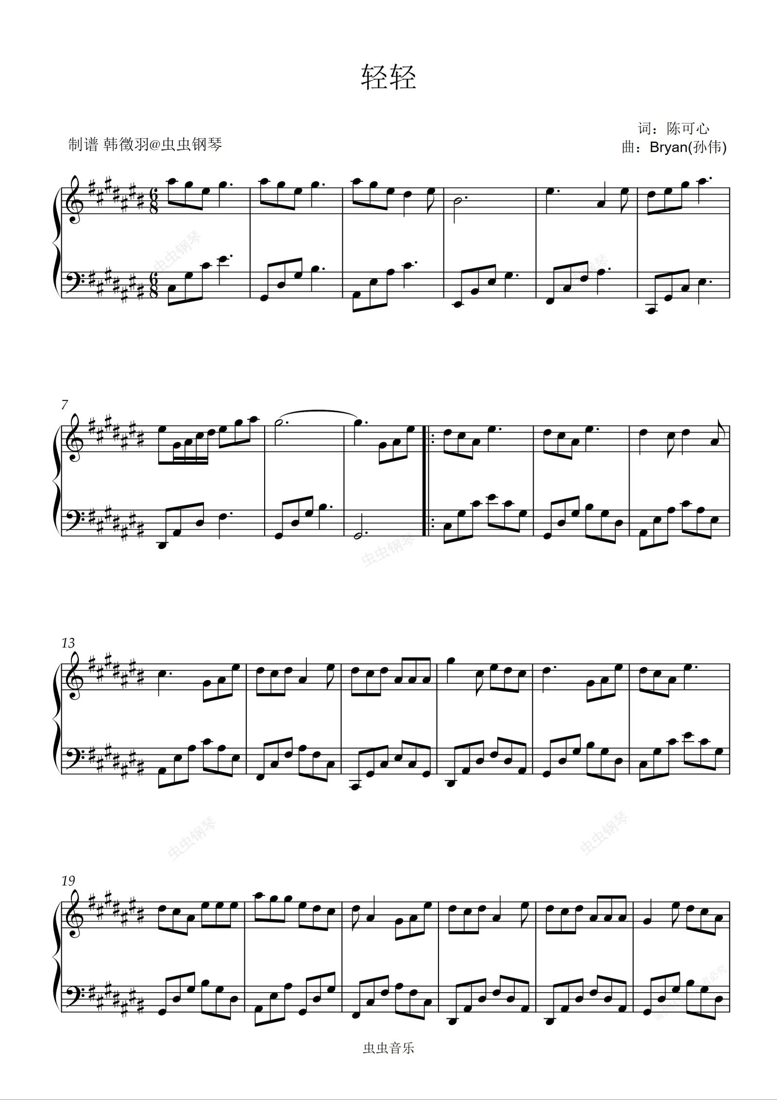 钢琴谱:轻轻 《长风渡》主题曲 原调好听易弹