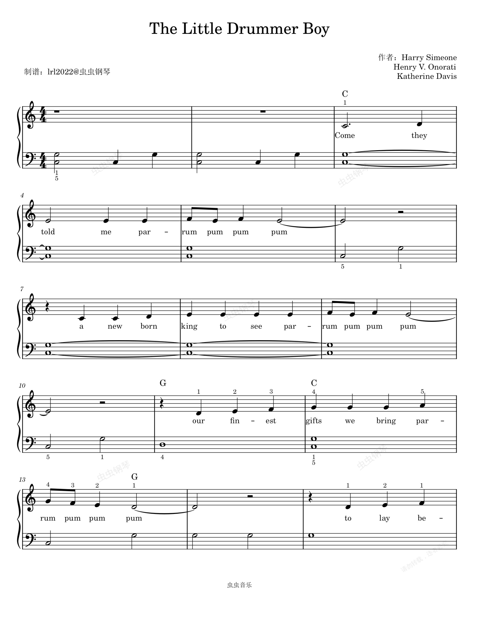 钢琴谱:The Little Drummer Boy - 钢琴独奏 - 简易版 - 歌词+指法