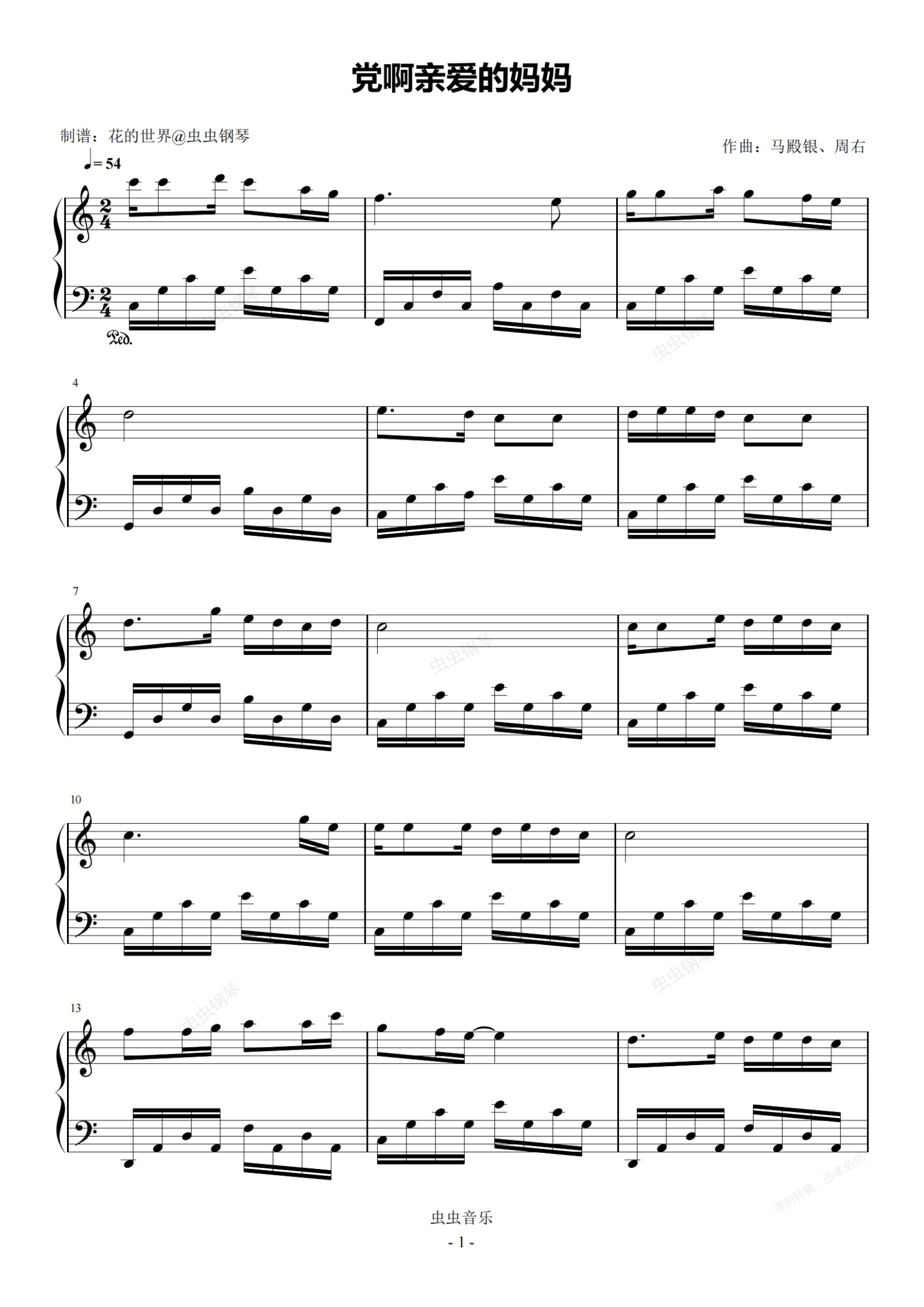 钢琴谱:党啊亲爱的妈妈 C调简易版 殷秀梅