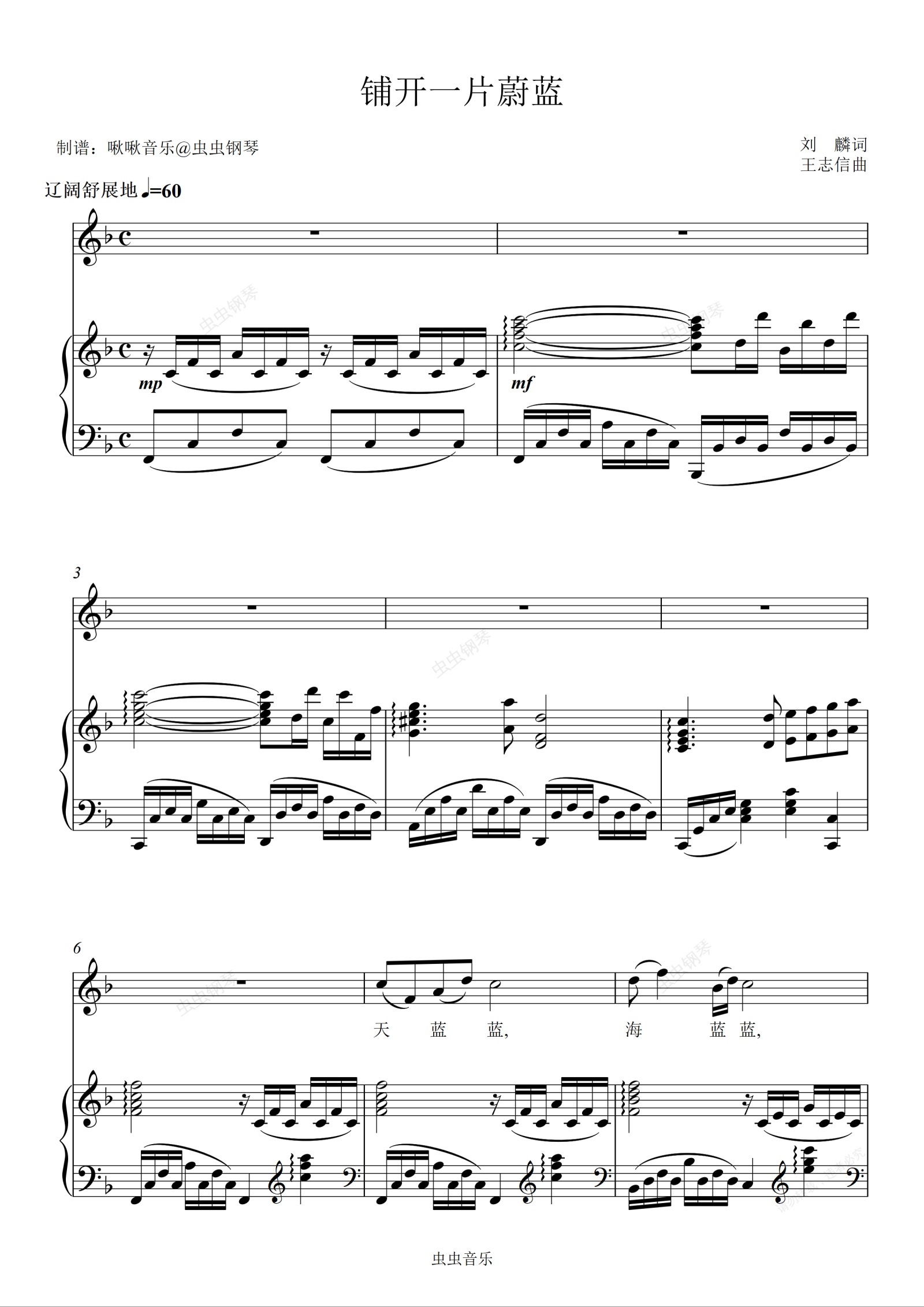 钢琴谱:铺开一片蔚蓝 钢琴弹唱伴奏谱