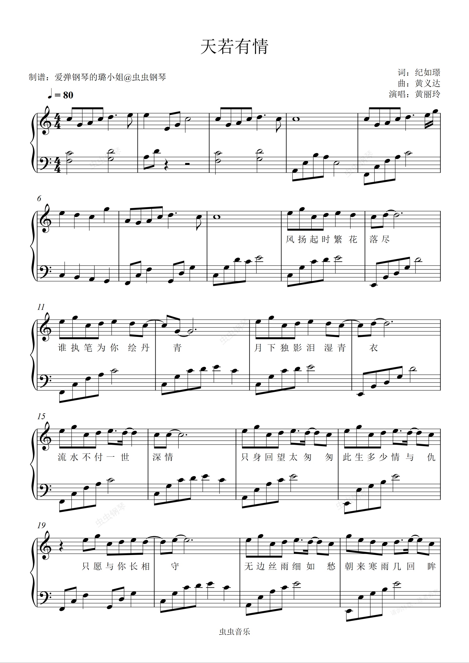 钢琴谱:天若有情《锦绣未央》黄丽玲 - C调简易版 - 附歌词