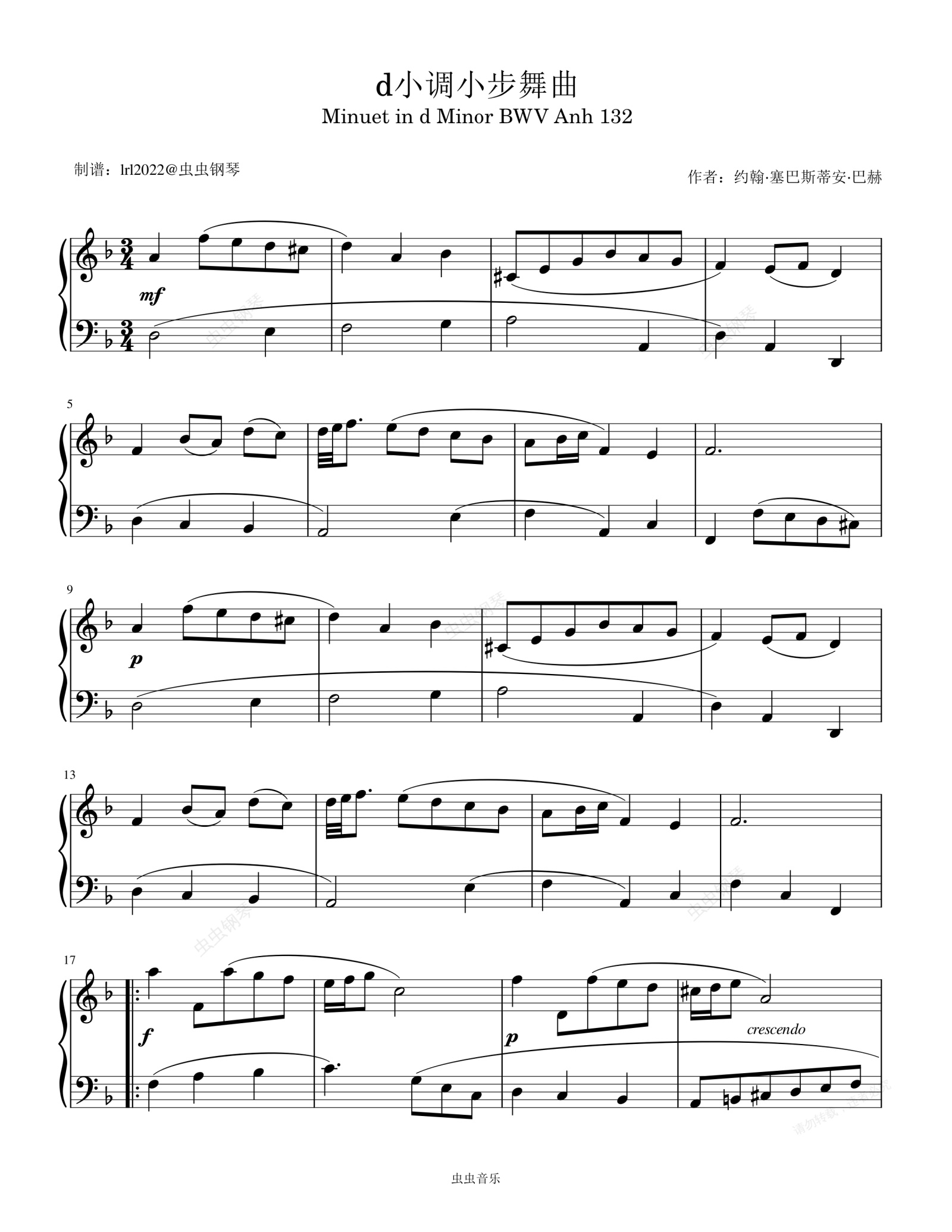 钢琴谱:巴赫 - d小调小步舞曲 - Minuet in d Minor - BWV Anh. 132 - 简易版