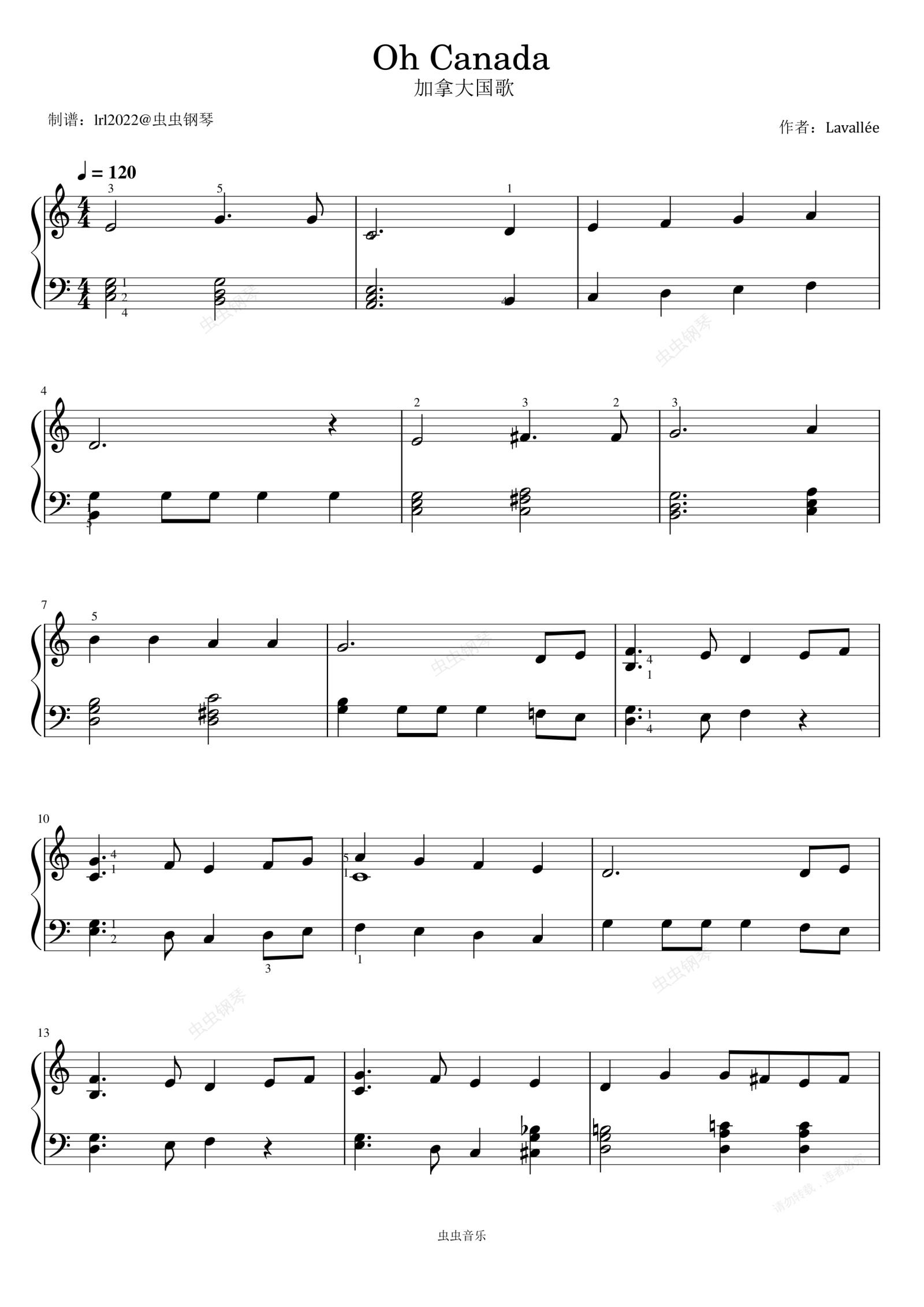 钢琴谱:Oh Canada - Canada's national anthem - 加拿大国歌 - 简易版 带指法