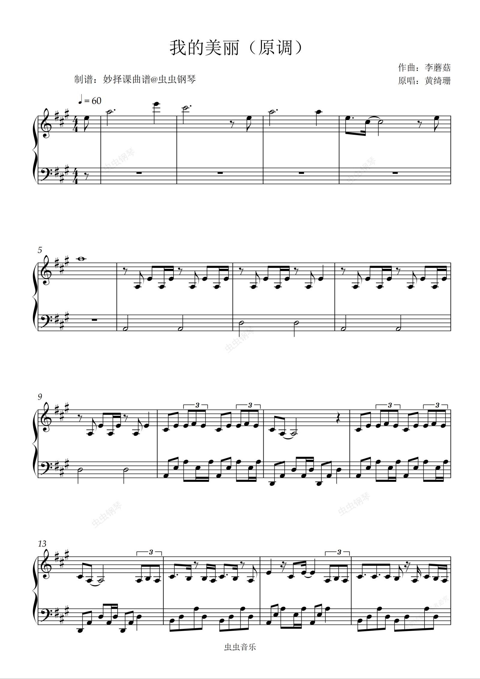 钢琴谱:黄绮珊原调《我的美丽》演唱谱
