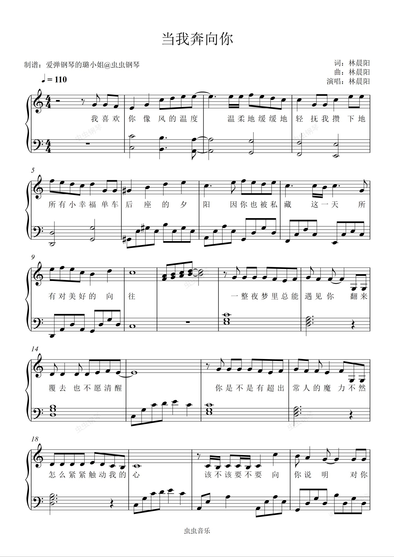 钢琴谱:当我奔向你《当我飞奔向你》主题曲 - C调简易版(无删减)- 附歌词