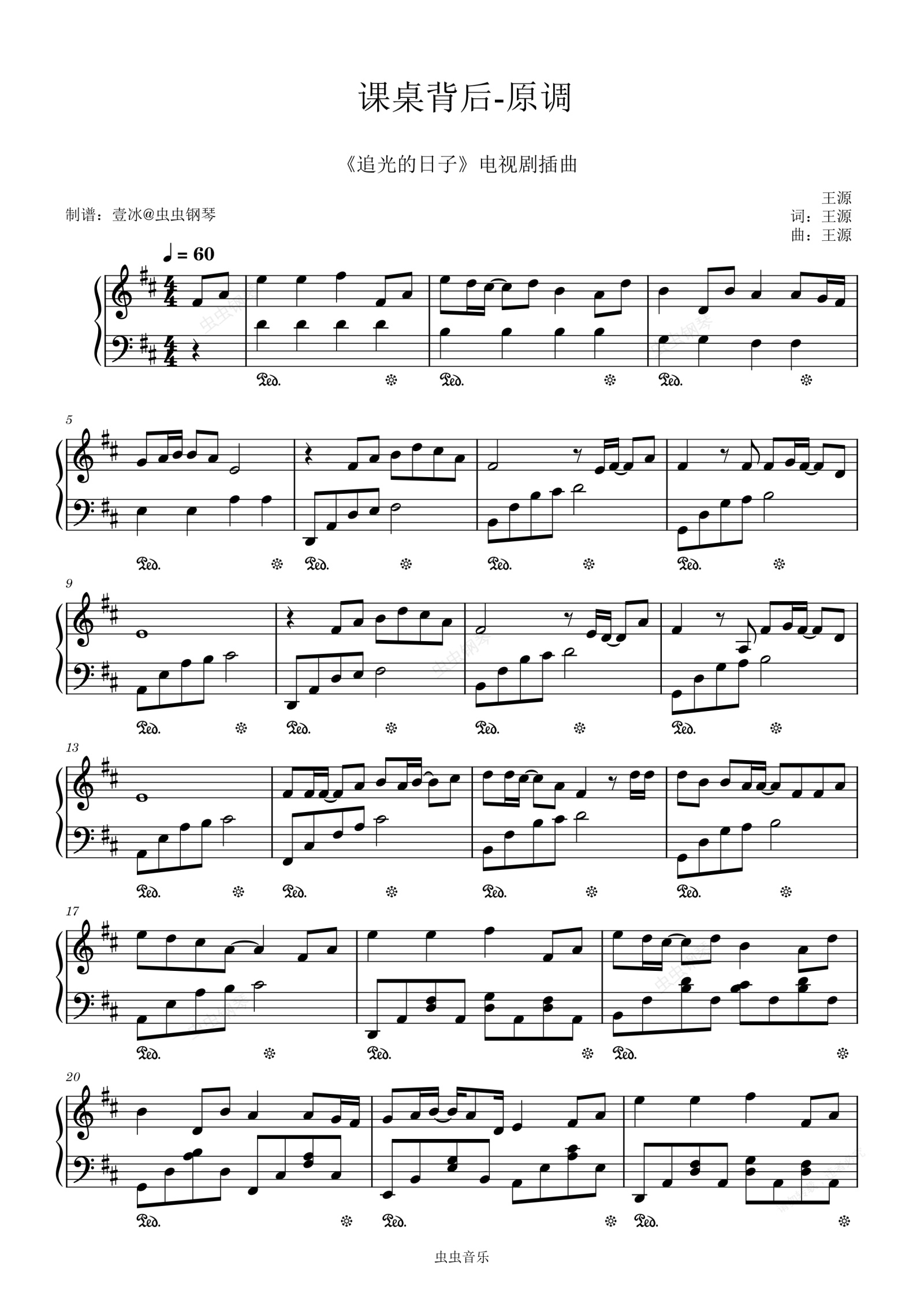 钢琴谱:课桌背后 (《追光的日子》电视剧插曲)  王源-原调