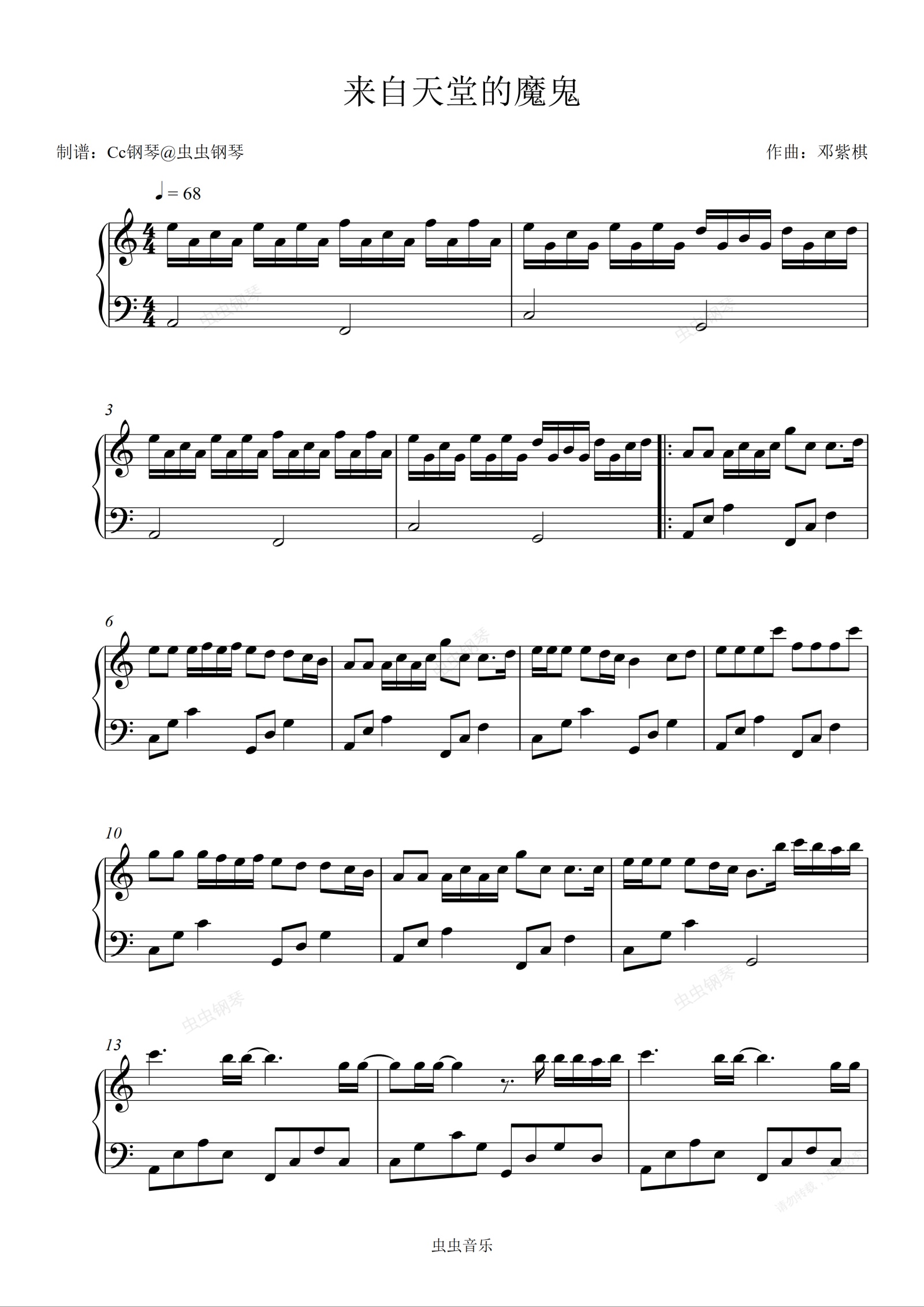钢琴谱:来自天堂的魔鬼 C调 好听易上手
