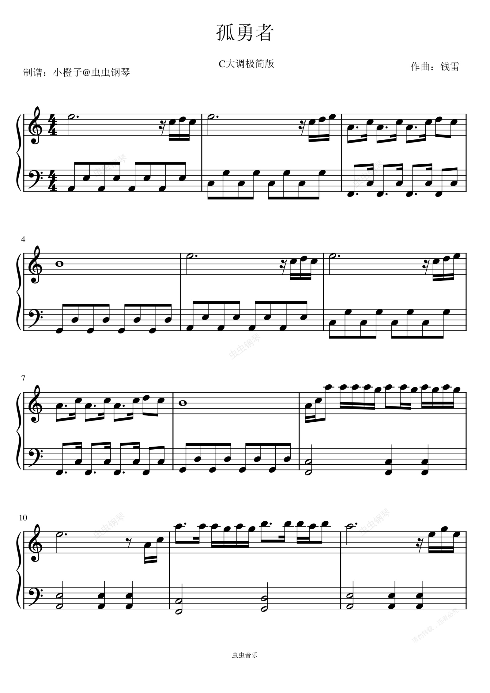 钢琴谱:⟪孤勇者⟫C大调巨简单版+拜厄难度