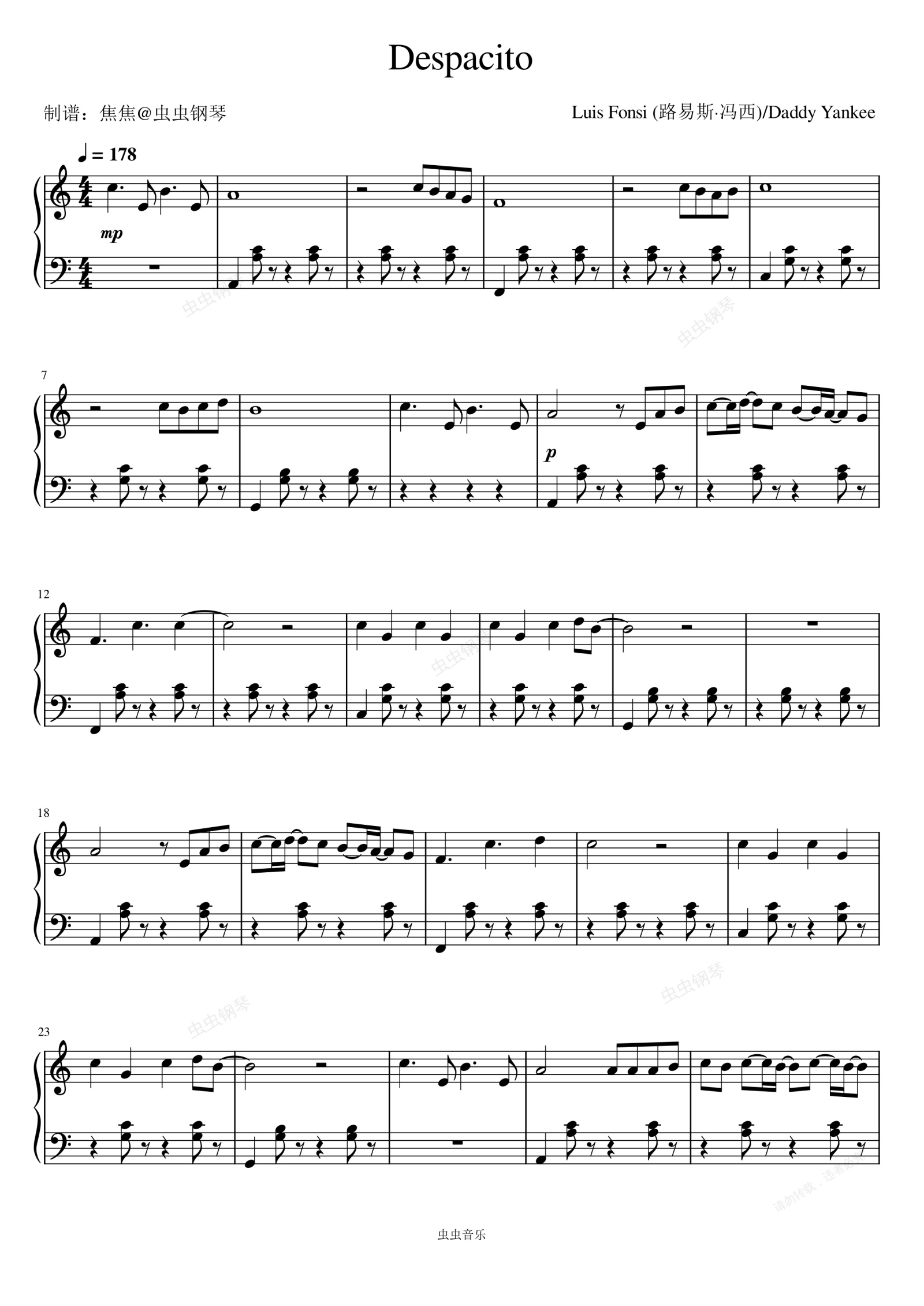 钢琴谱:Despacito - Luis Fonsi (路易斯·冯西)/Daddy Yankee