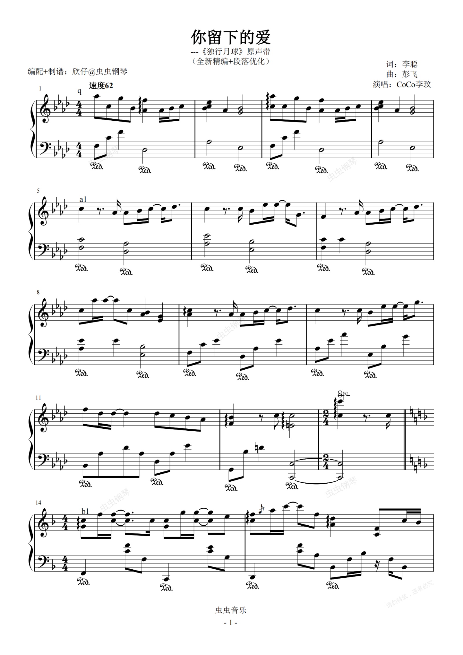 钢琴谱:李玟-《你留下的爱》(《独行月球》原声带、全新精编+段落优化、降A-F-G调)