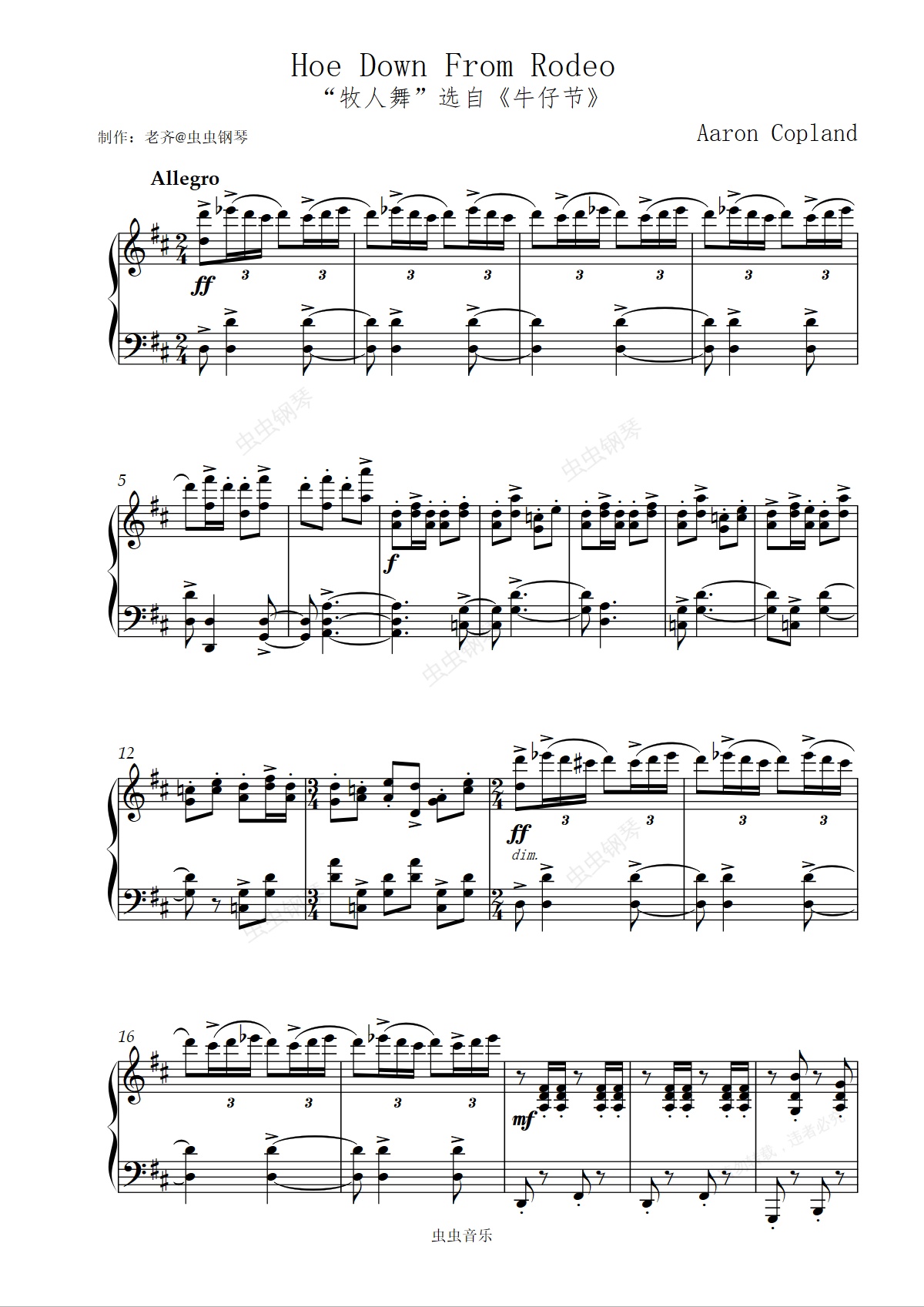 钢琴谱:“牧人舞”选自《牛仔节》Hoe Down From Rodeo