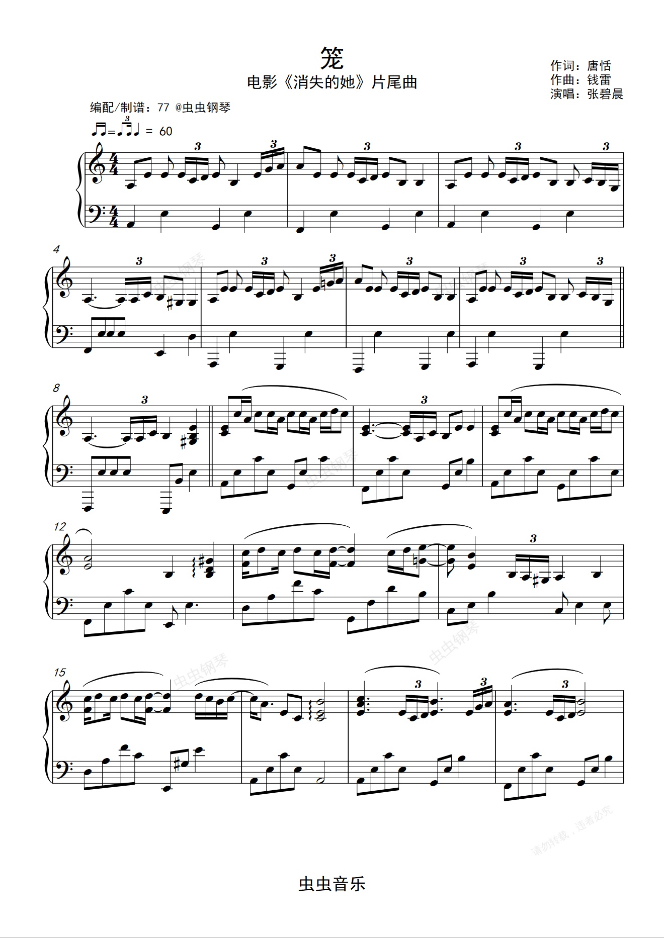 钢琴谱:张碧晨-《笼》钢琴独奏 电影(消失的她)片尾曲