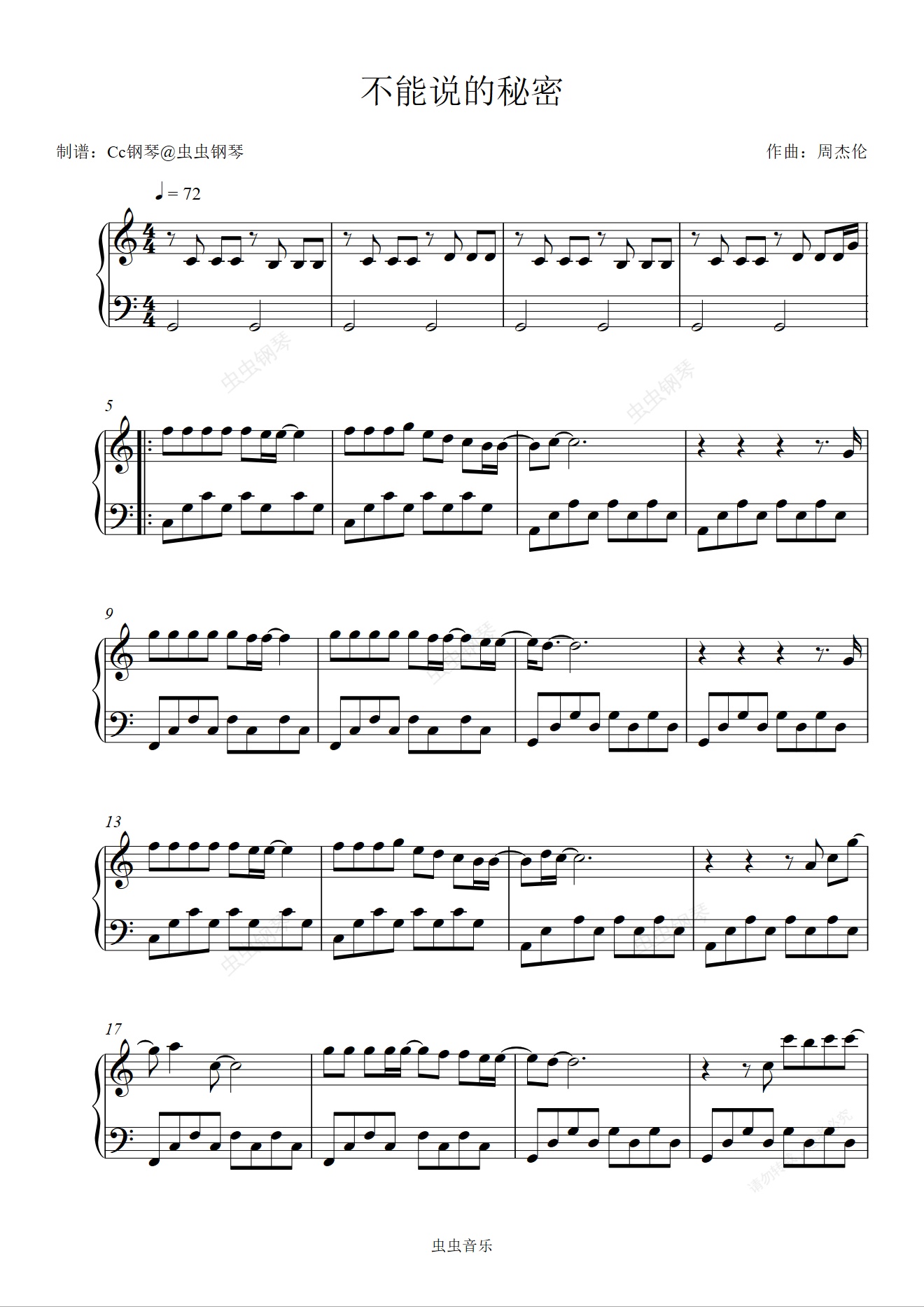 钢琴谱:不能说的秘密 C调 好听易上手