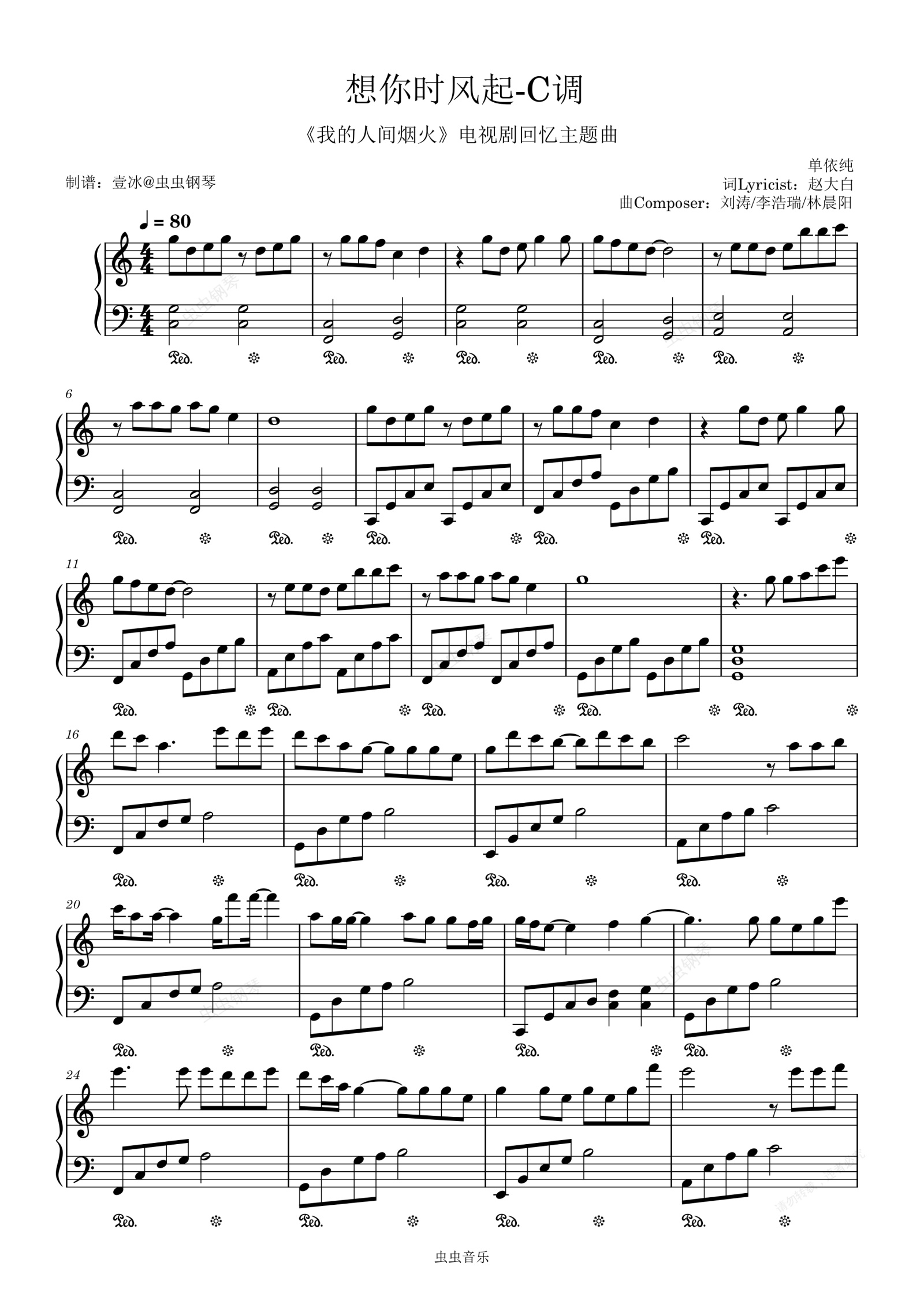 钢琴谱:想你时风起 (《我的人间烟火》电视剧回忆主题曲) - C调