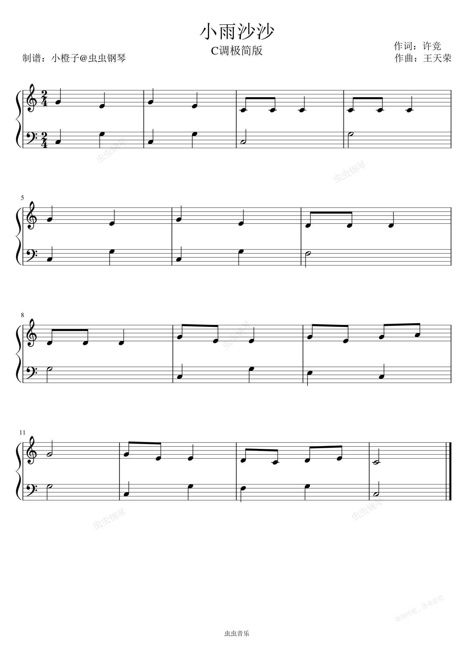 钢琴谱:⟪小雨沙沙⟫ C调入门+左手单音