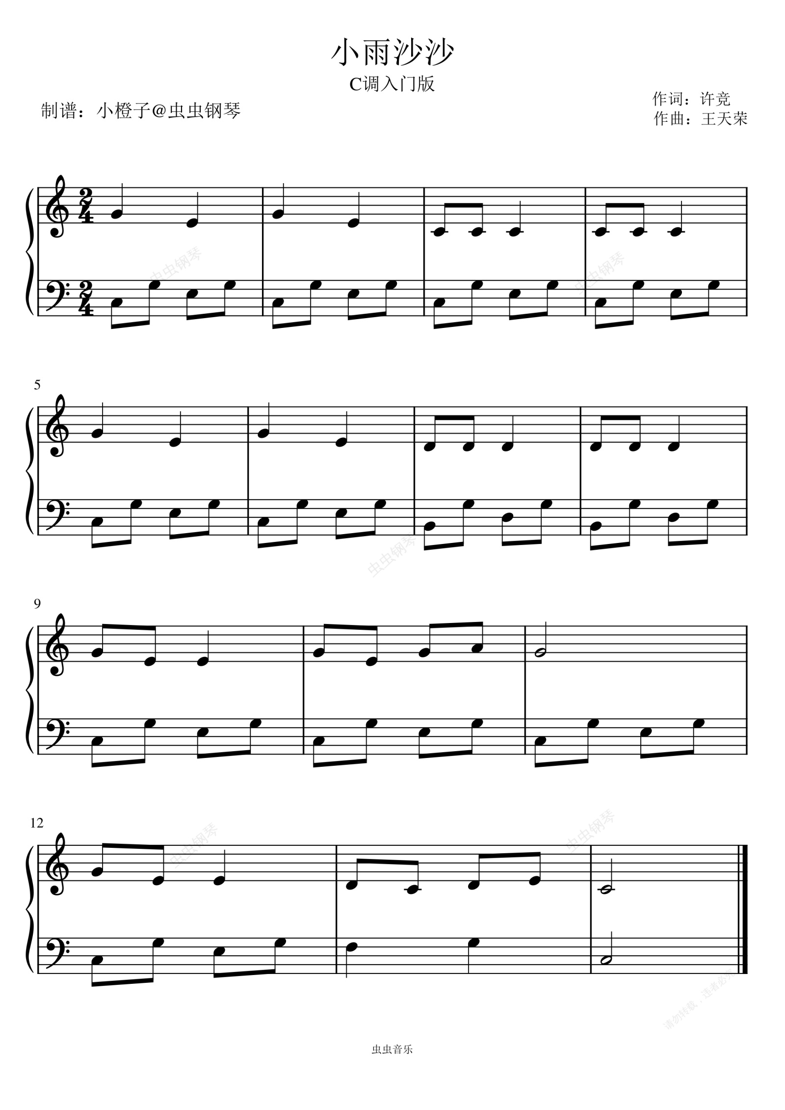 钢琴谱:⟪小雨沙沙⟫C调入门版+初学难度