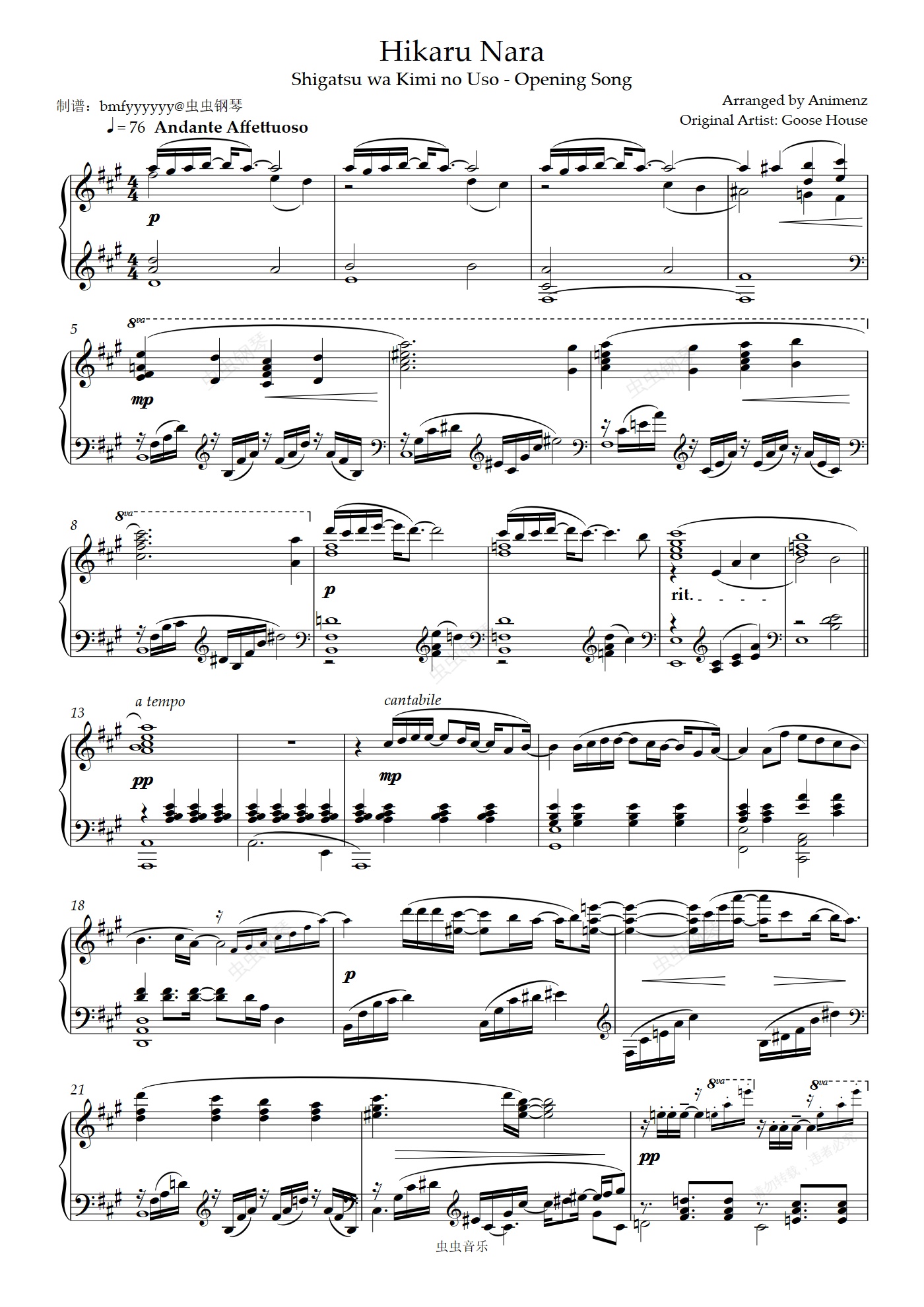 钢琴谱:【Animenz】Hikaru Nara 四月是你的谎言