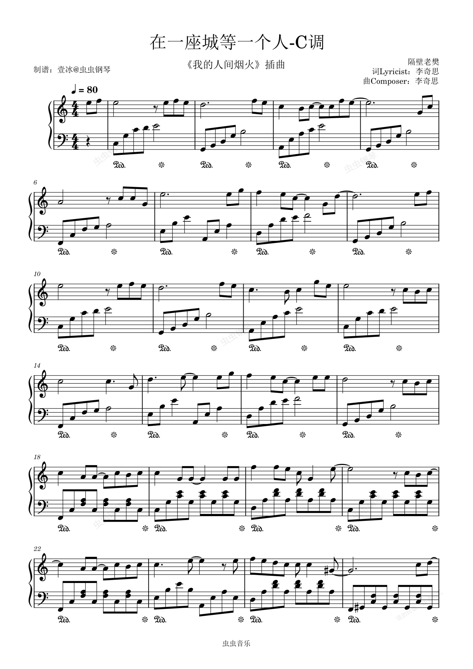 钢琴谱:在一座城等一个人//《我的人间烟火》插曲-C调
