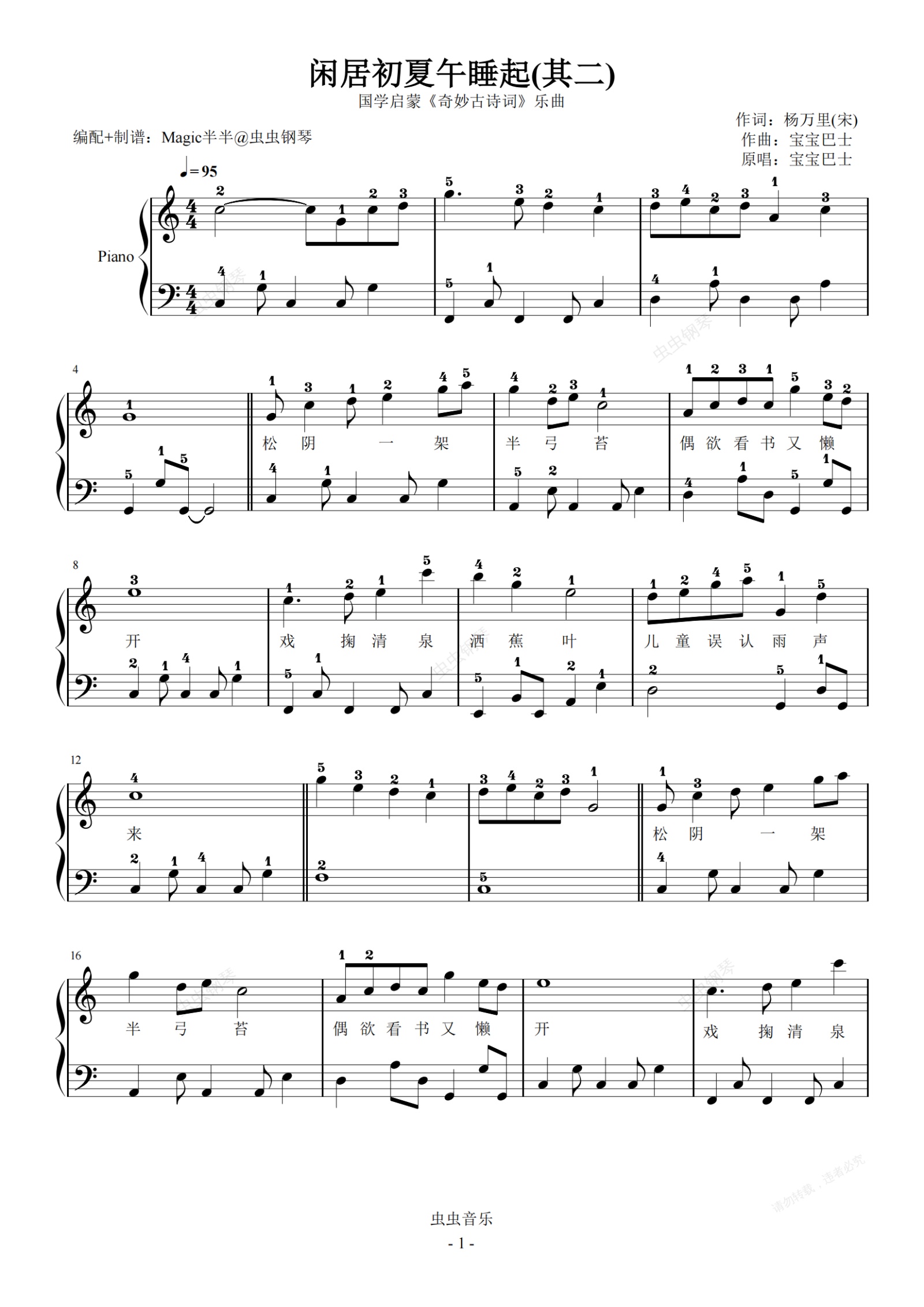 钢琴谱:奇妙古诗词/闲居初夏午睡起(其二)(带指法)