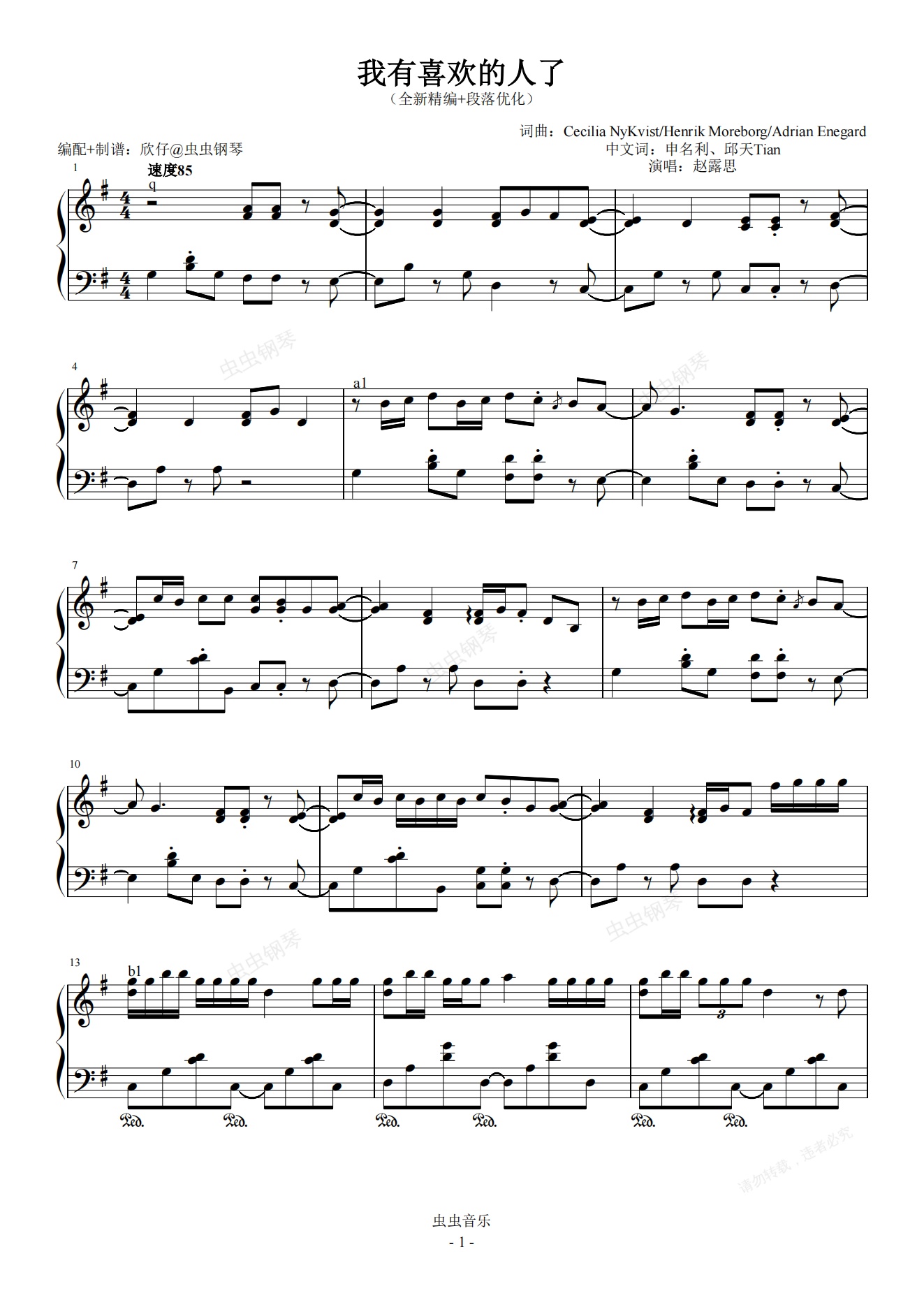 钢琴谱:赵露思-G《我有喜欢的人了》(全新精编+段落优化)