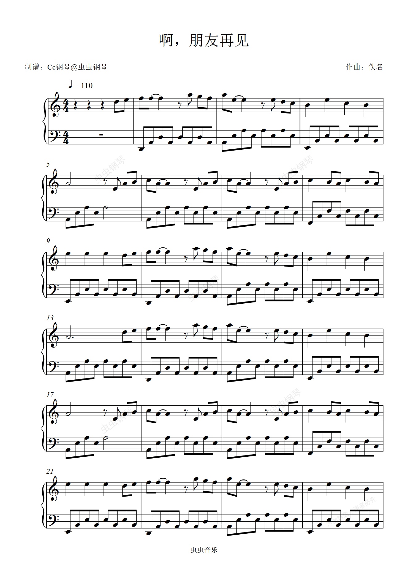 钢琴谱:啊,朋友再见 C调 好听易上手