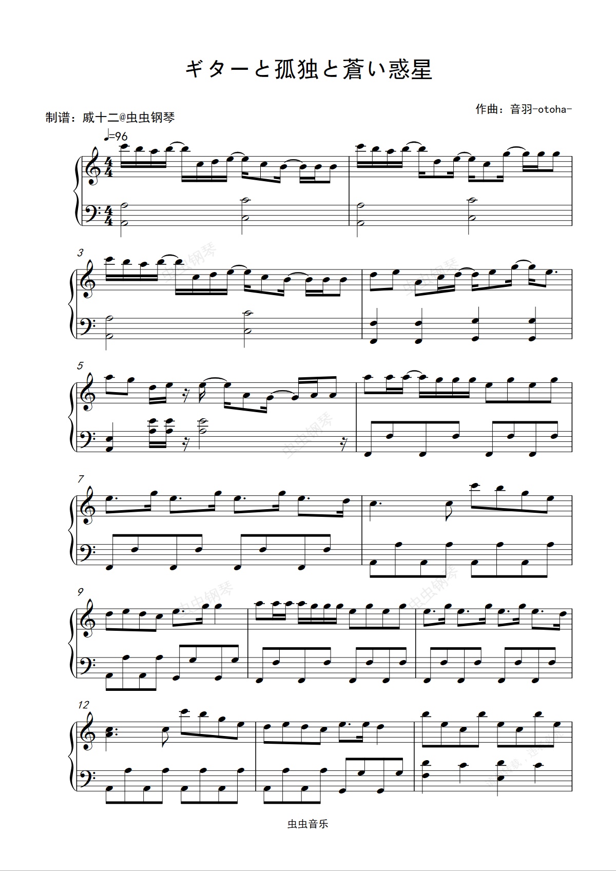 钢琴谱:ギターと孤独と蒼い惑星(孤独摇滚 )-C调简单版