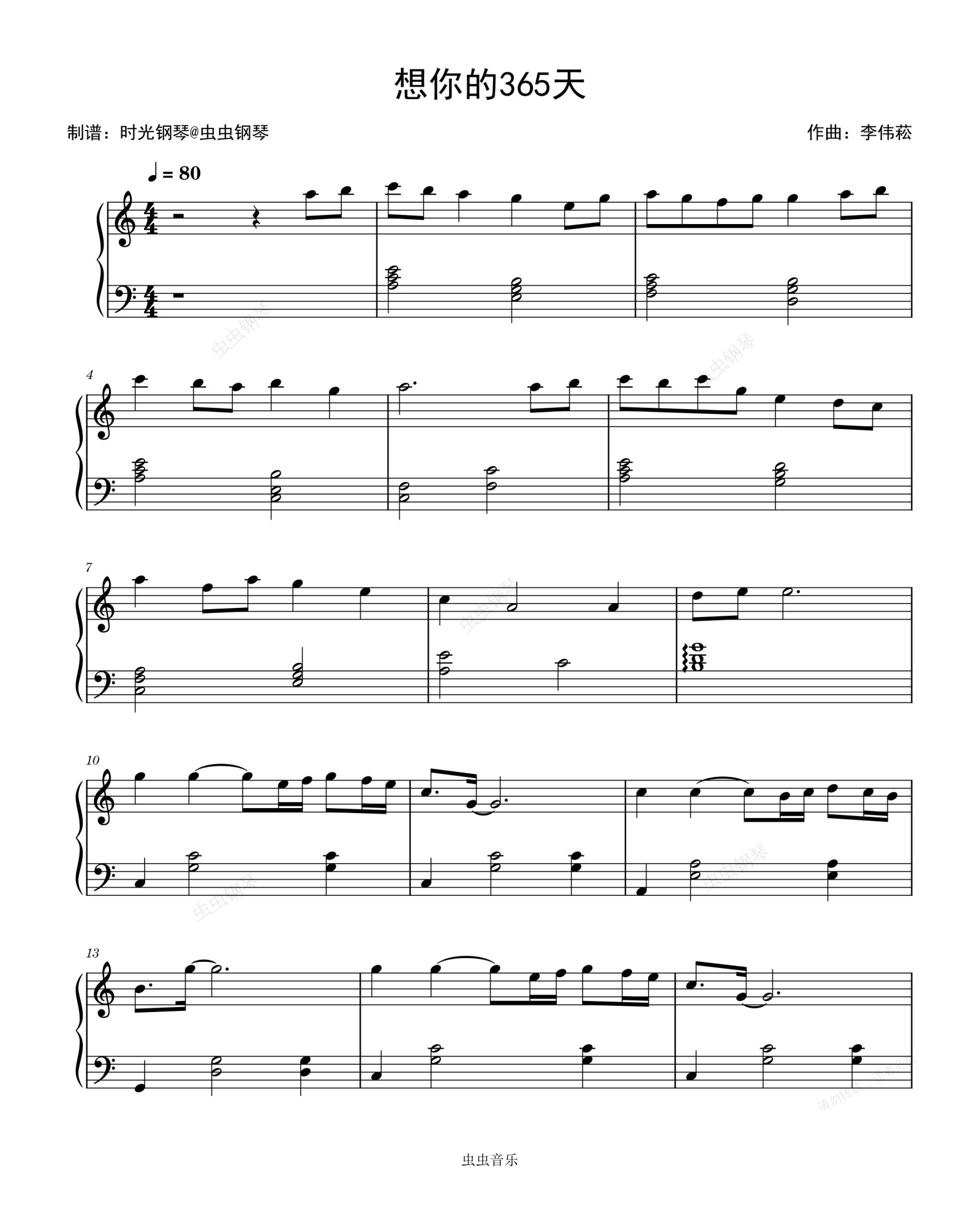 钢琴谱:想你的365天 李玟 简单好听