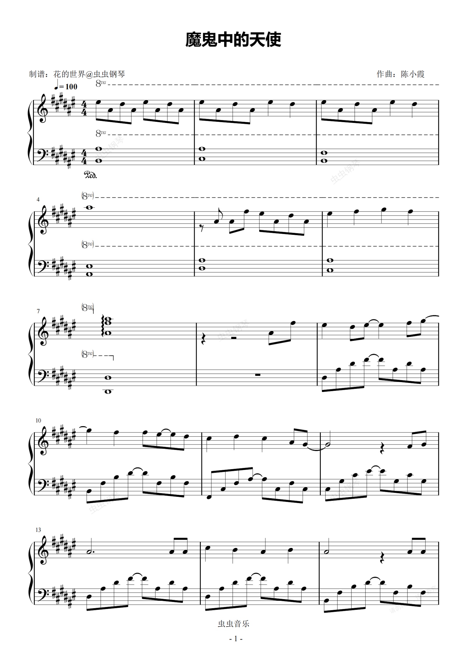 钢琴谱:魔鬼中的天使 原调简易版  田馥甄