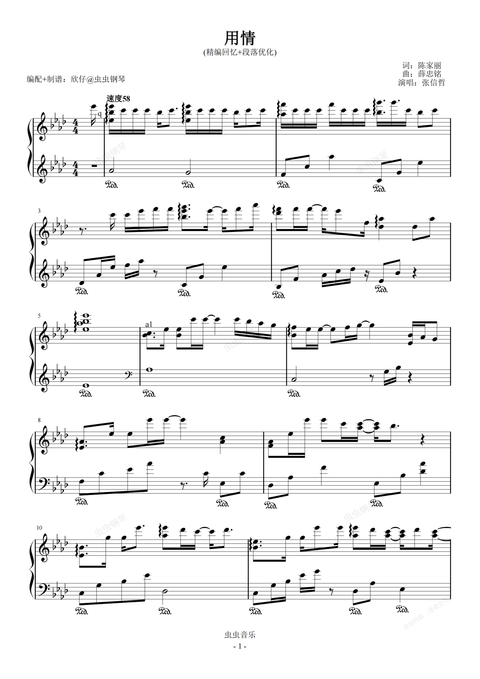 钢琴谱:张信哲-降A《用情》(精编回忆+段落优化)