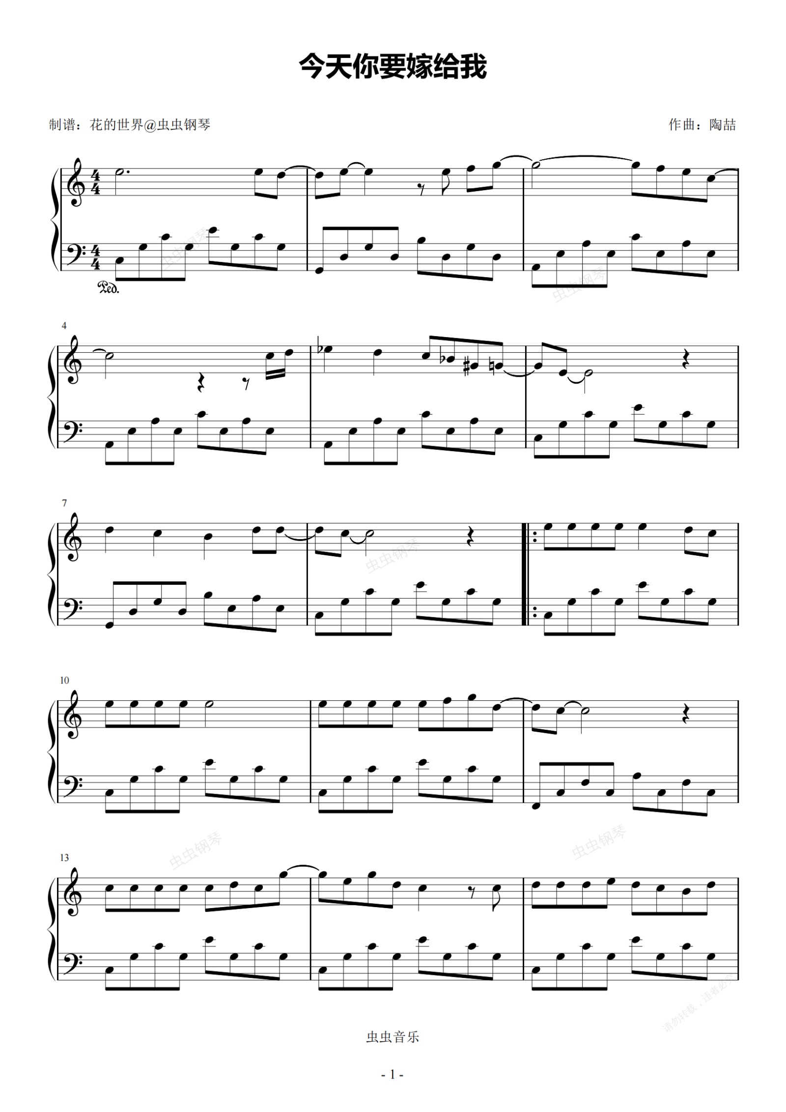 钢琴谱:今天你要嫁给我 C调简易版 蔡依琳/陶喆