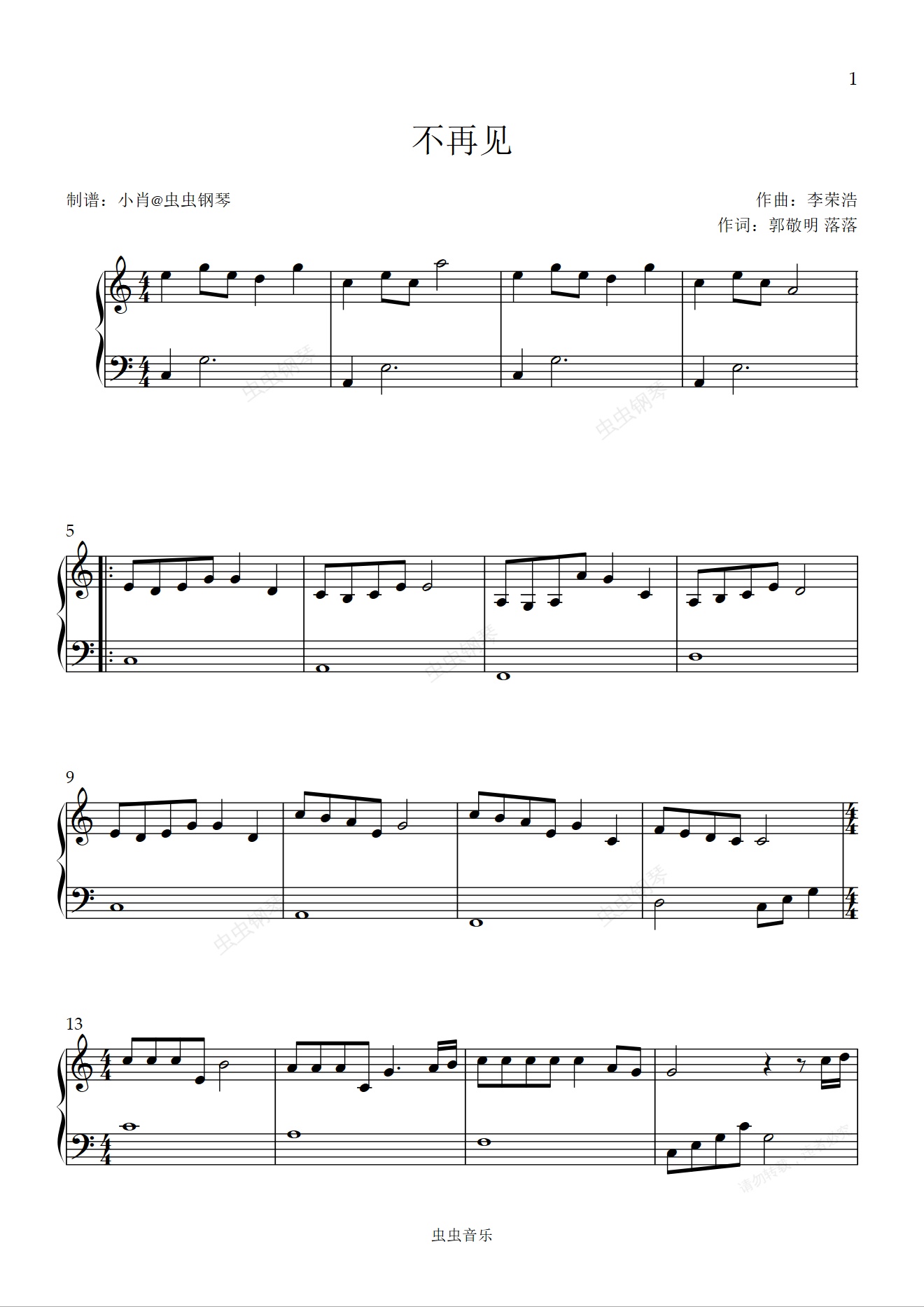 钢琴谱:不再见 完整c调简易版