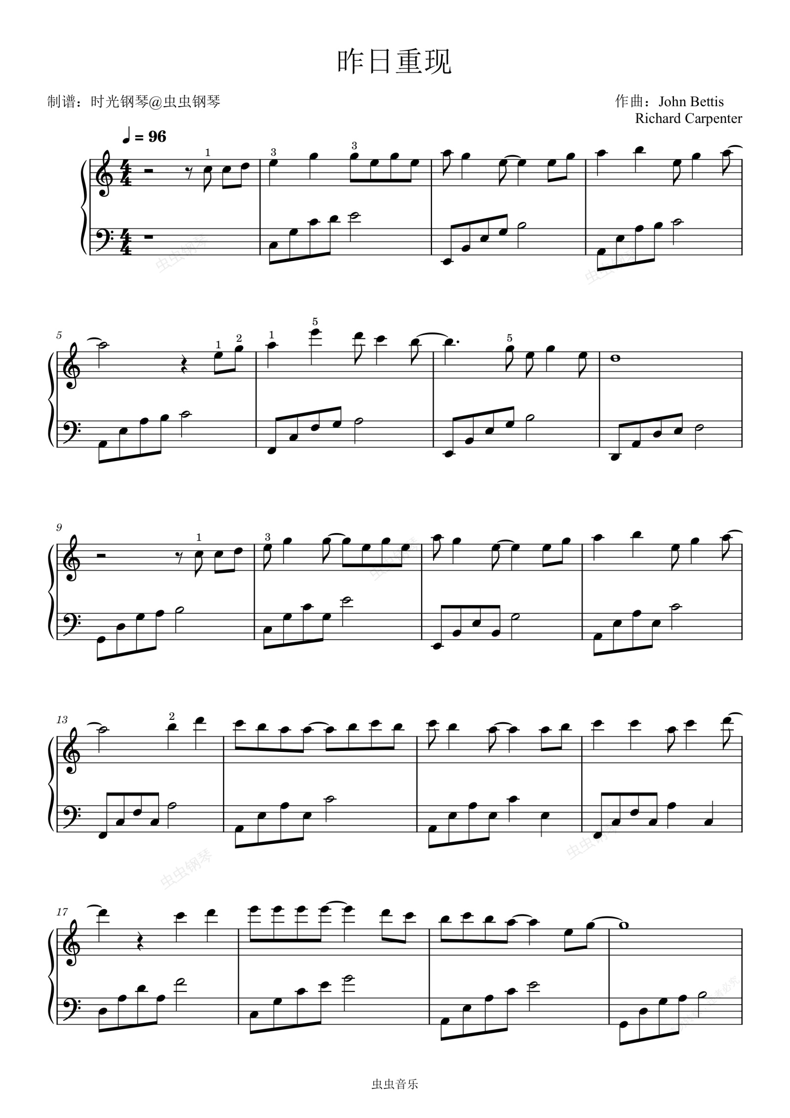 钢琴谱:昨日重现 Carpenters 简单好听