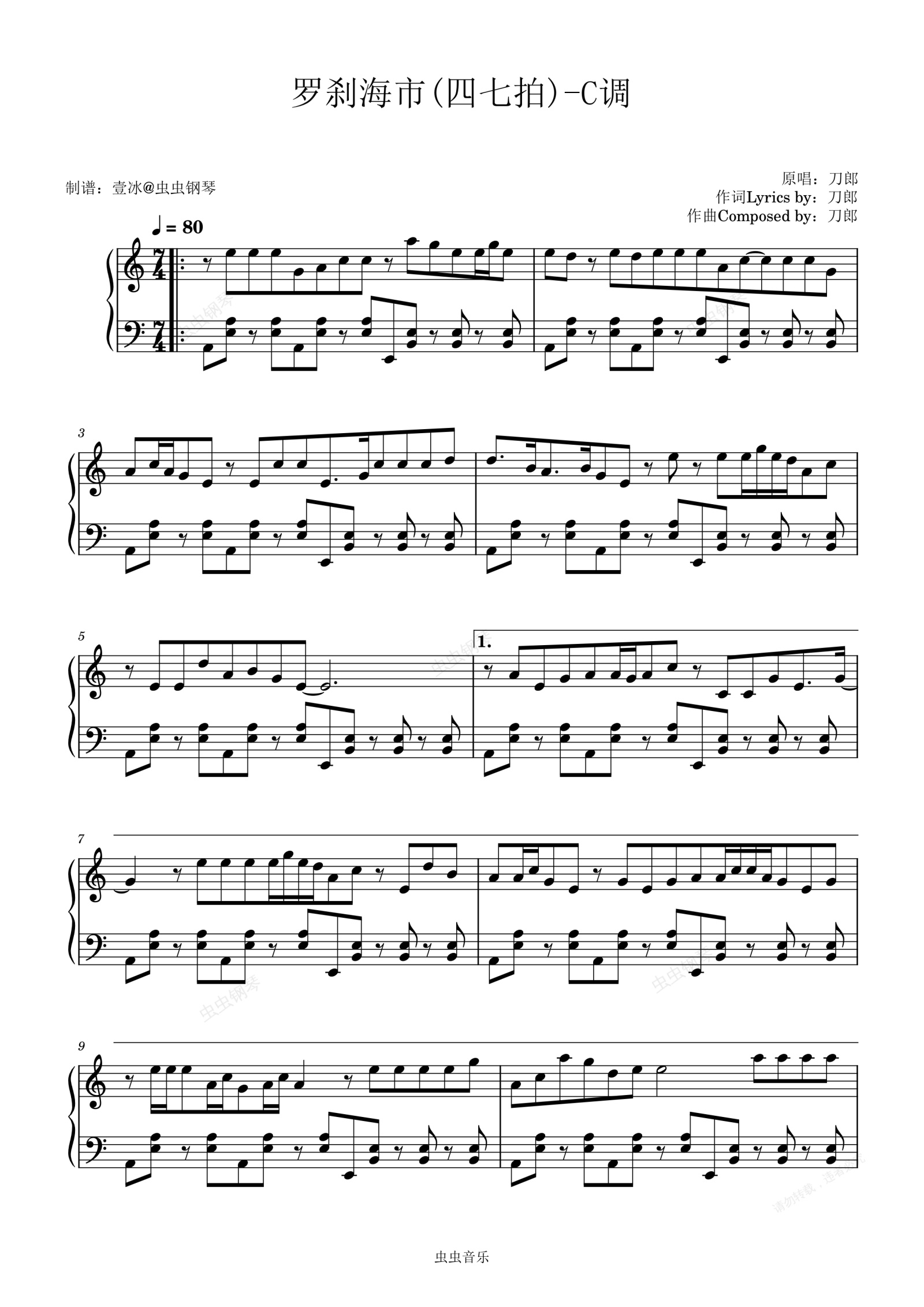 钢琴谱:罗刹海市(四七拍)//刀郎- C调(与之前的有一些不同)