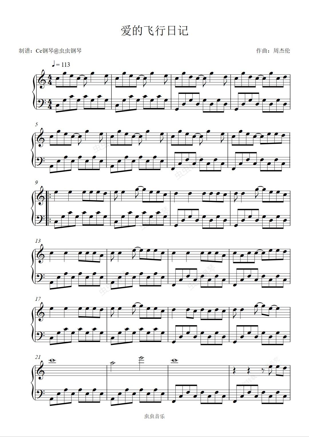 钢琴谱:爱的飞行日记 C调 好听易上手