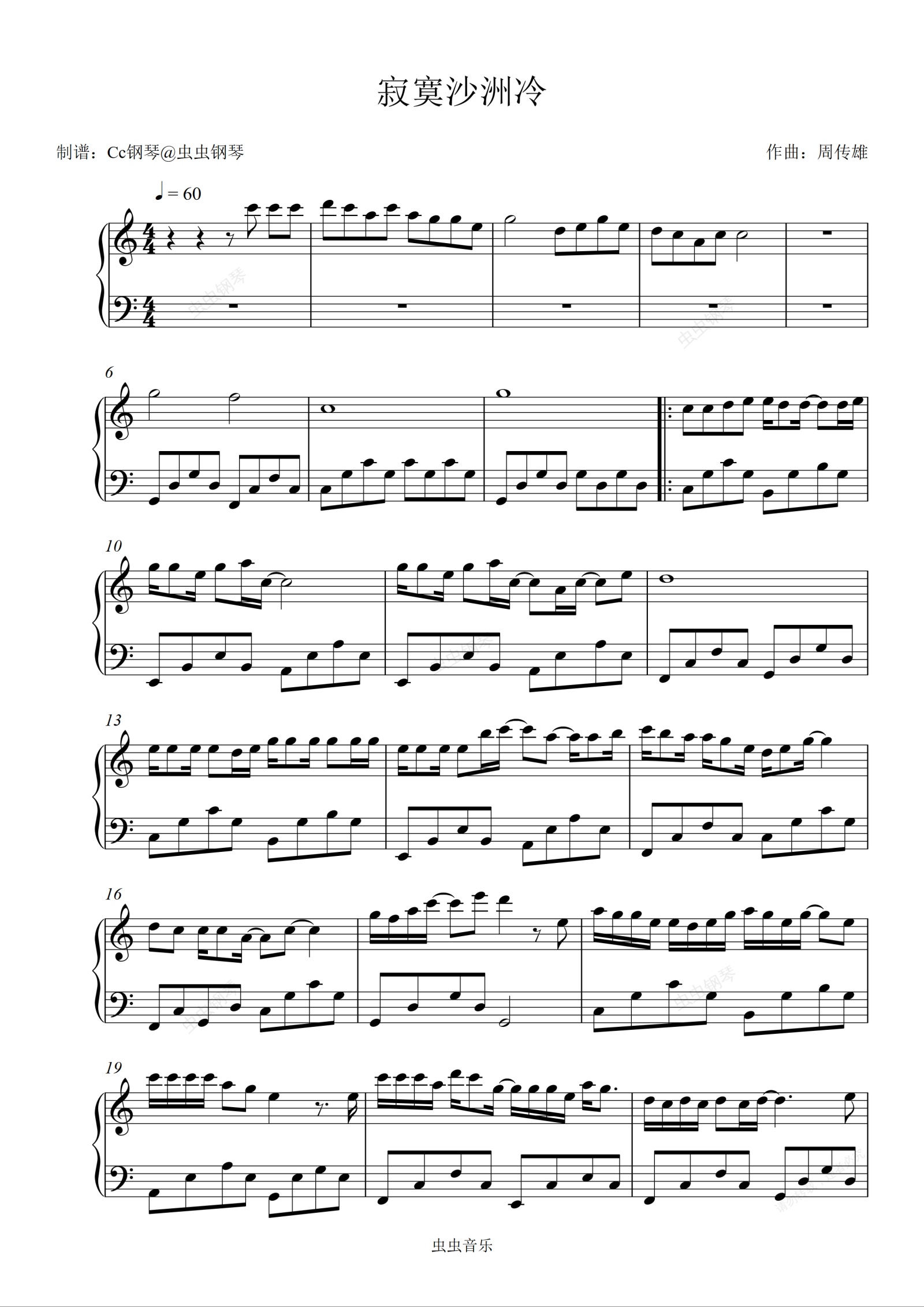 钢琴谱:寂寞沙洲冷 C调 好听易上手