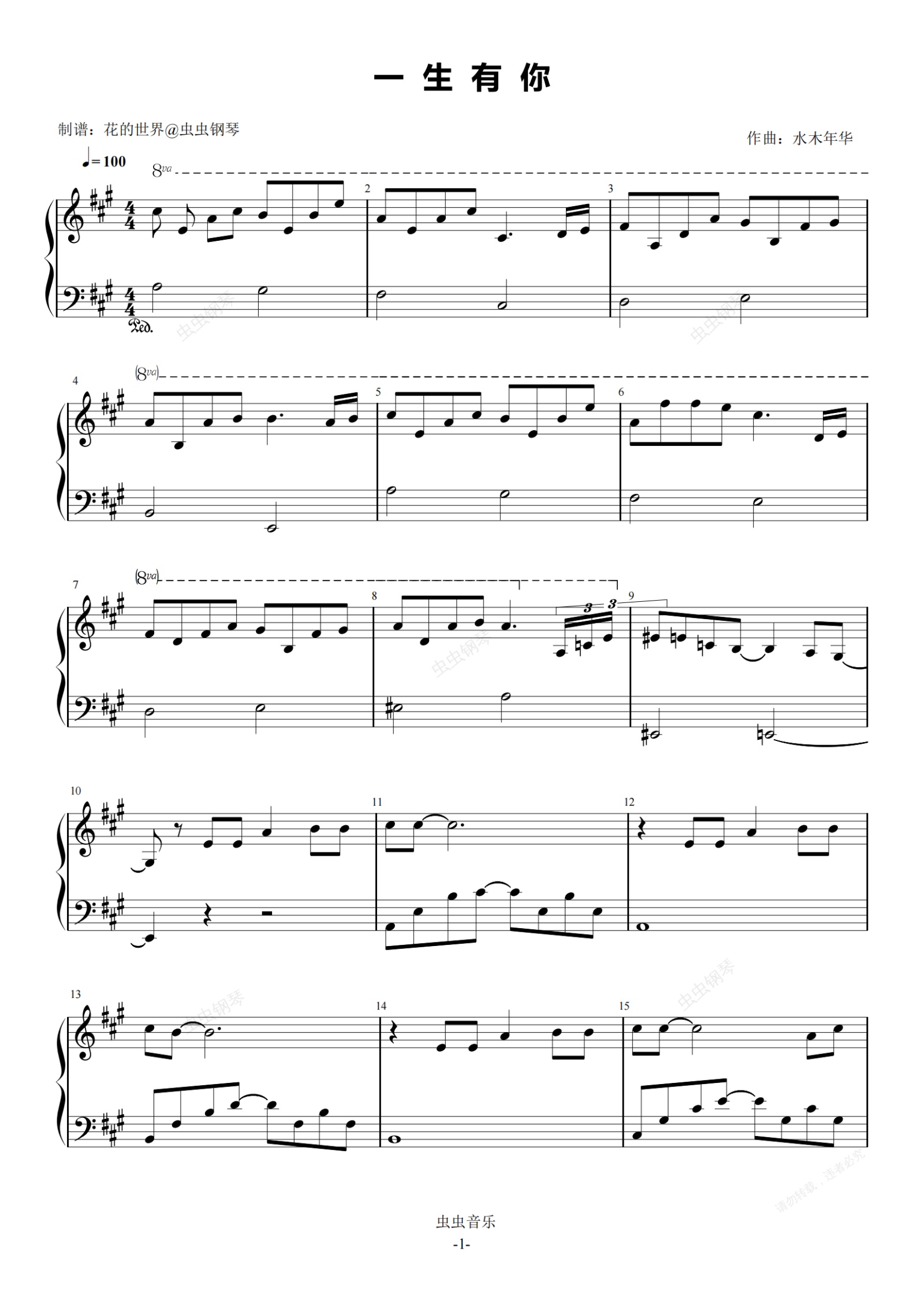 钢琴谱:一生有你 原调简易版 水木年华  流行经典