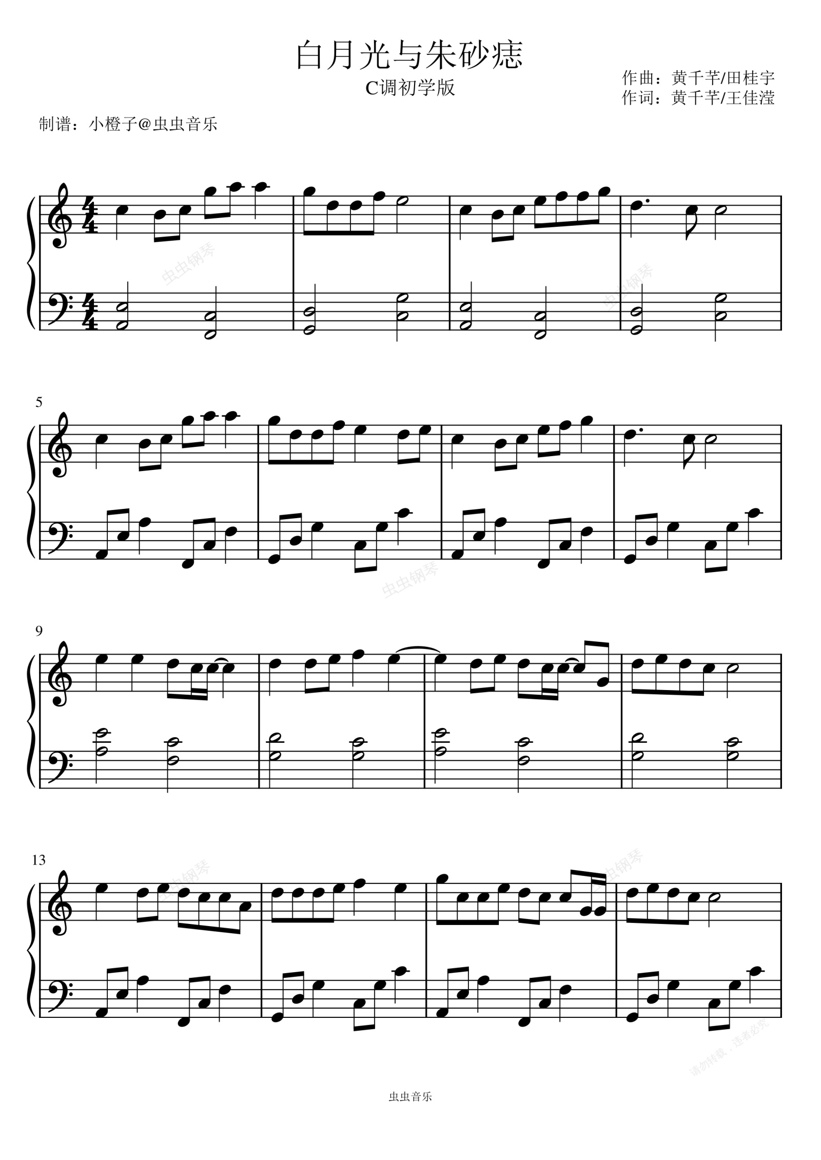钢琴谱:⟪白月光与朱砂痣⟫C调简易版+拜厄难度