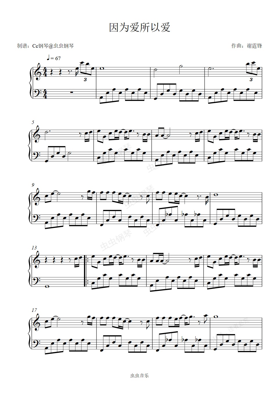 钢琴谱:因为爱所以爱 C调 好听易上手