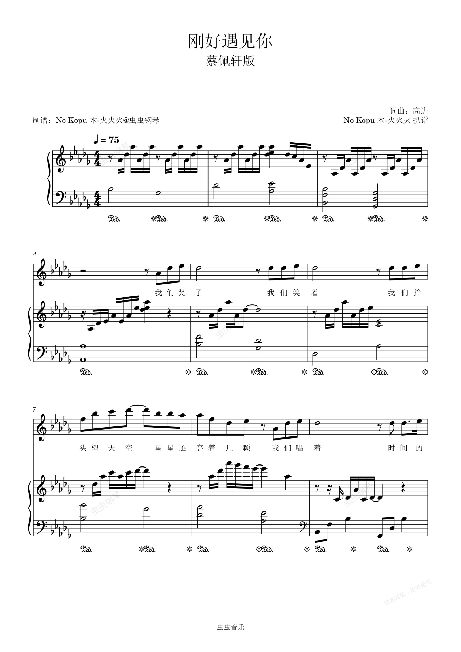 钢琴谱:原调《刚好遇见你》蔡佩轩版弹唱谱