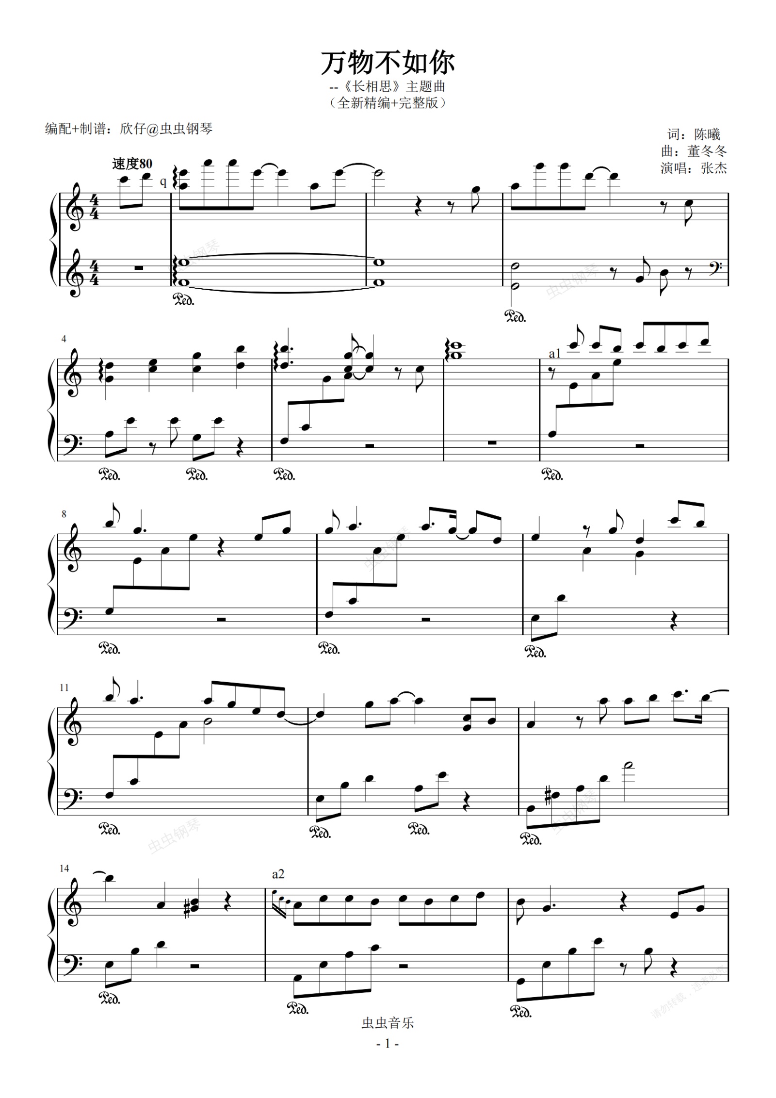 钢琴谱:张杰-C《万物不如你》(《长相思》主题曲、完整版)