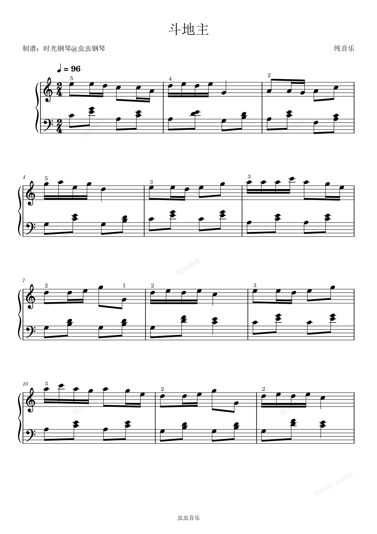 钢琴谱:斗地主 简单好听 (C调加指法版)