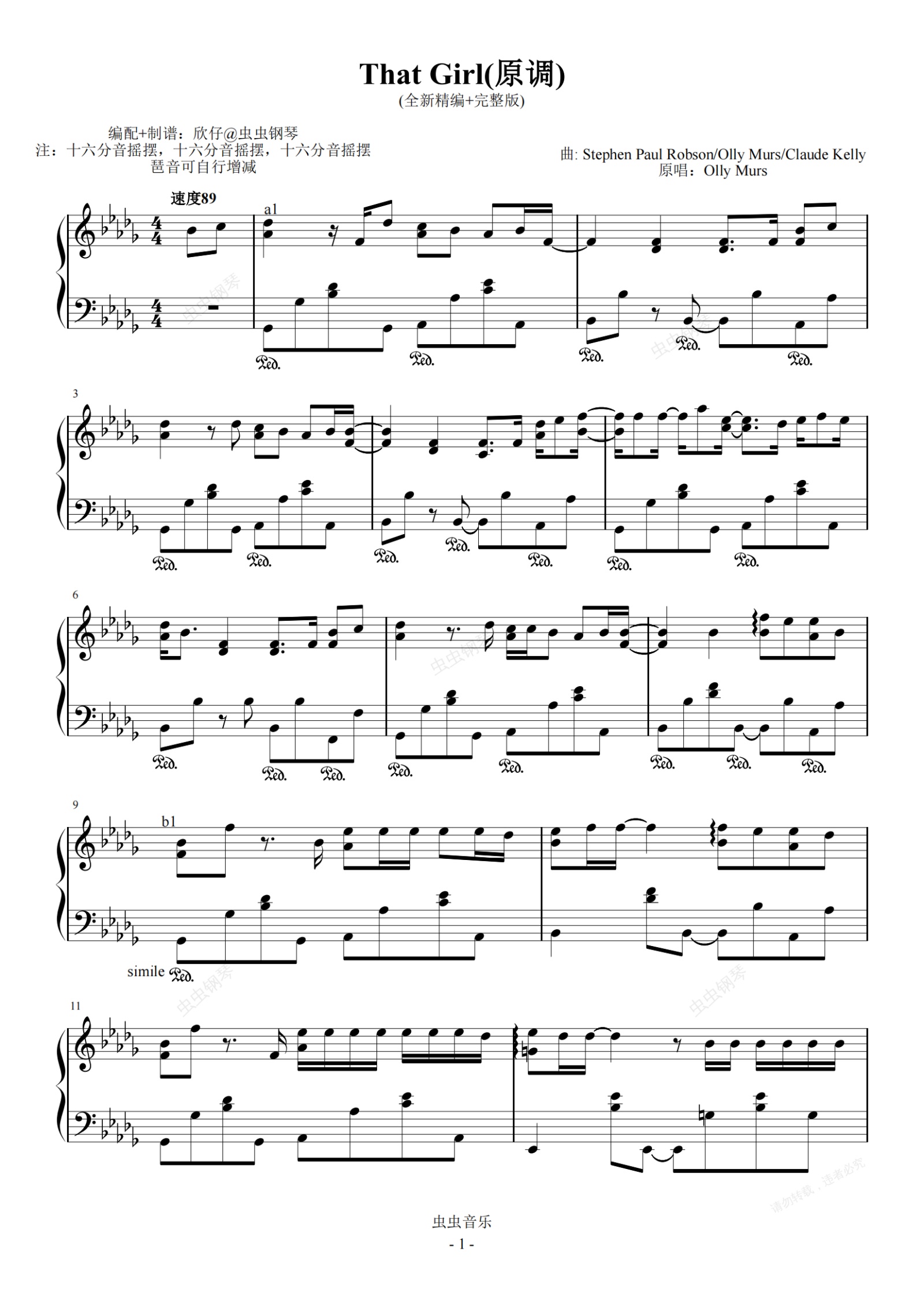 钢琴谱:Olly Murs-降b《That Girl》(全新精编+完整版)