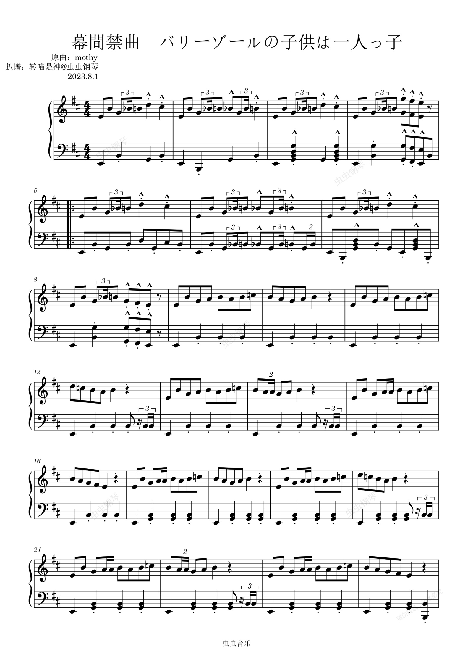 钢琴谱:幕間禁曲 バリーゾールの子供は一人っ子(巴利索尔家的孩子是独生子)