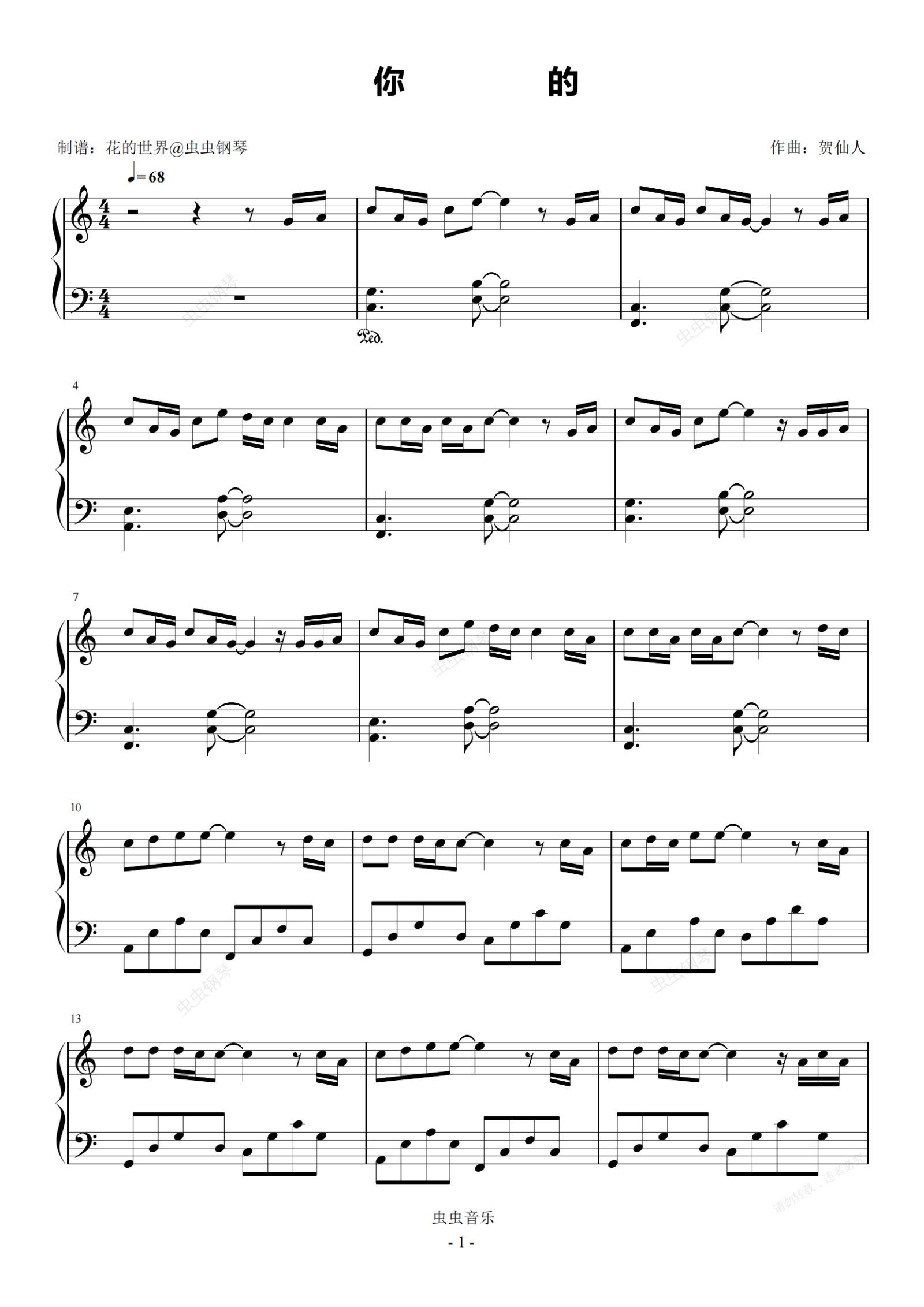 钢琴谱:你的 C调简易版 贺仙人