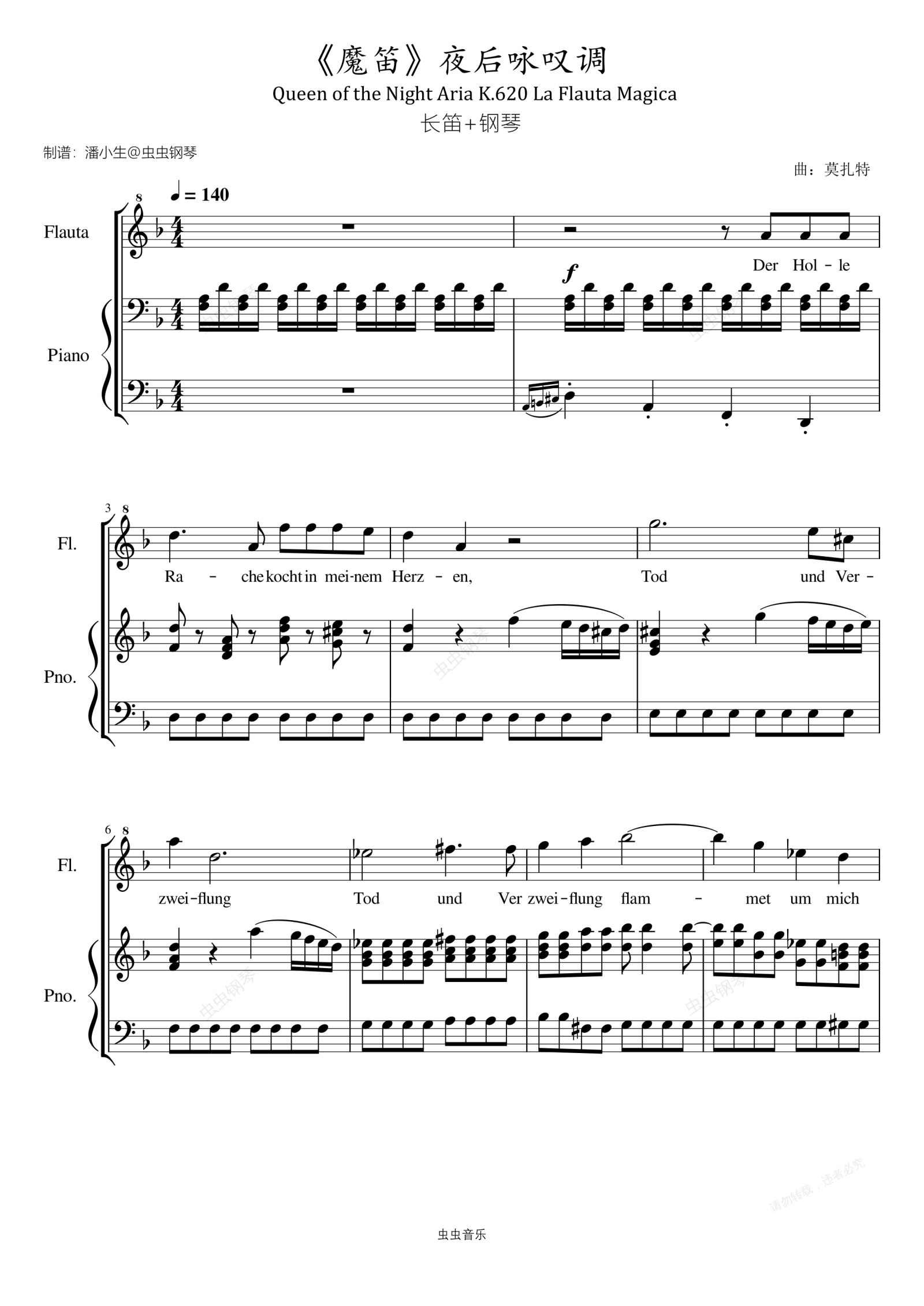 钢琴谱:莫扎特《魔笛》 夜后咏叹调 原版带指法 长笛+钢琴 Queen of the Night Aria K.620