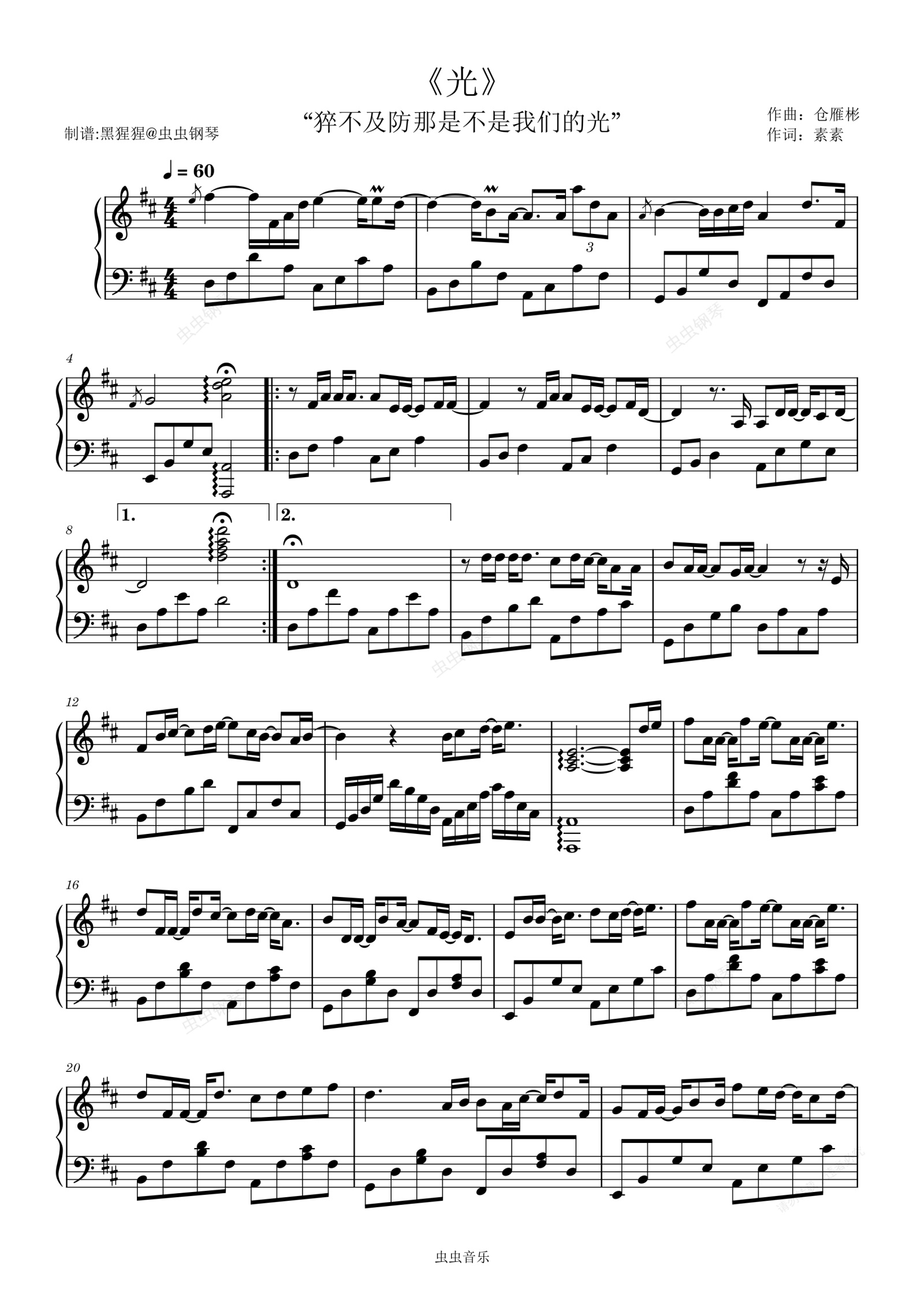 钢琴谱:张哲瀚-D调 《光》